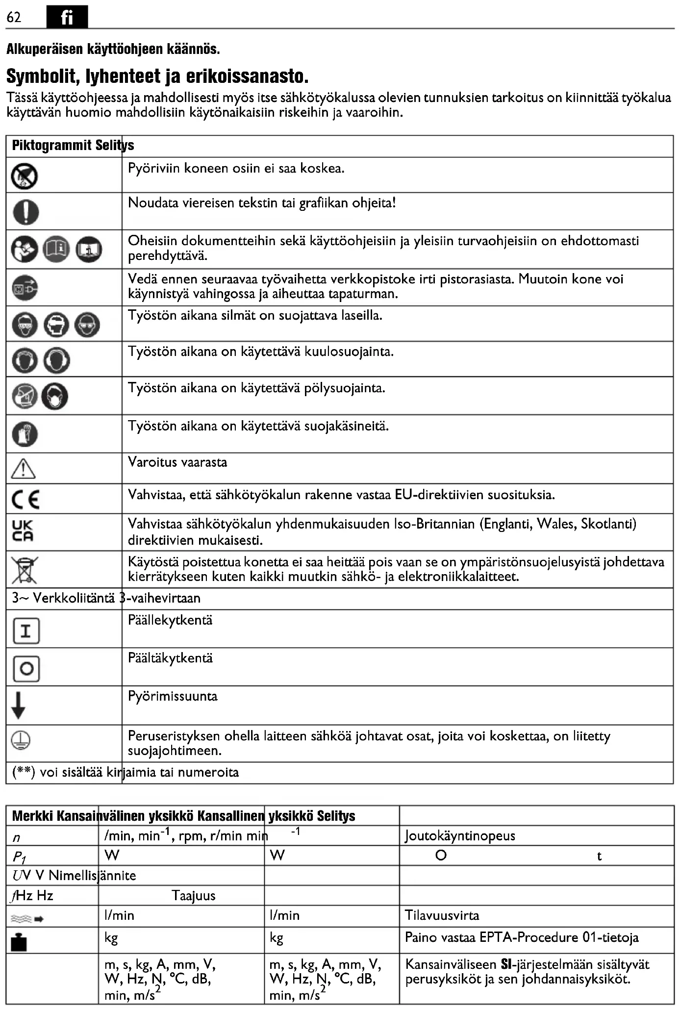 Alkuperäisen käyttöohjeen käännös. Symbolit, lyhenteet ja erikoissanasto. Tässä käyttöohjeessa ja mahdollisesti myös itse sähkötyökalussa olevien tunnuksien tarkoitus on kiinnittää työkalua käyttävän huomio mahdollisiin käytönaikaisiin riskeihin ja vaaroihin. Piktogrammit Selitys Pyöriviin koneen osiin ei saa koskea. Noudata viereisen tekstin tai grafiikan ohjeita! Oheisiin dokumentteihin sekä käyttöohjeisiin ja yleisiin turvaohjeisiin on ehdottomasti perehdyttävä. Vedä ennen seuraavaa työvaihetta verkkopistoke irti pistorasiasta. Muutoin kone voi käynnistyä vahingossa ja aiheuttaa tapaturman. Työstön aikana silmät on suojattava laseilla. Työstön aikana on käytettävä kuulosuojainta. Työstön aikana on käytettävä pölysuojainta. Työstön aikana on käytettävä suojakäsineitä. Varoitus vaarasta Vahvistaa, että sähkötyökalun rakenne vastaa EU-direktiivien suosituksia. Vahvistaa sähkötyökalun yhdenmukaisuuden Iso-Britannian (Englanti, Wales, Skotlanti) direktiivien mukaisesti. Käytöstä poistettua konetta ei saa heittää pois vaan se on ympäristönsuojelusyistä johdettava kierrätykseen kuten kaikki muutkin sähkö- ja elektroniikkalaitteet. 3~ Verkkoliitäntä 3-vaihevirtaan Päällekytkentä Päältäkytkentä Pyörimissuunta Peruseristyksen ohella laitteen sähköä johtavat osat, joita voi koskettaa, on liitetty suojajohtimeen. (**) voi sisältää kirjaimia tai numeroita Merkki Kansainvälinen yksikkö Kansallinen yksikkö Selitys