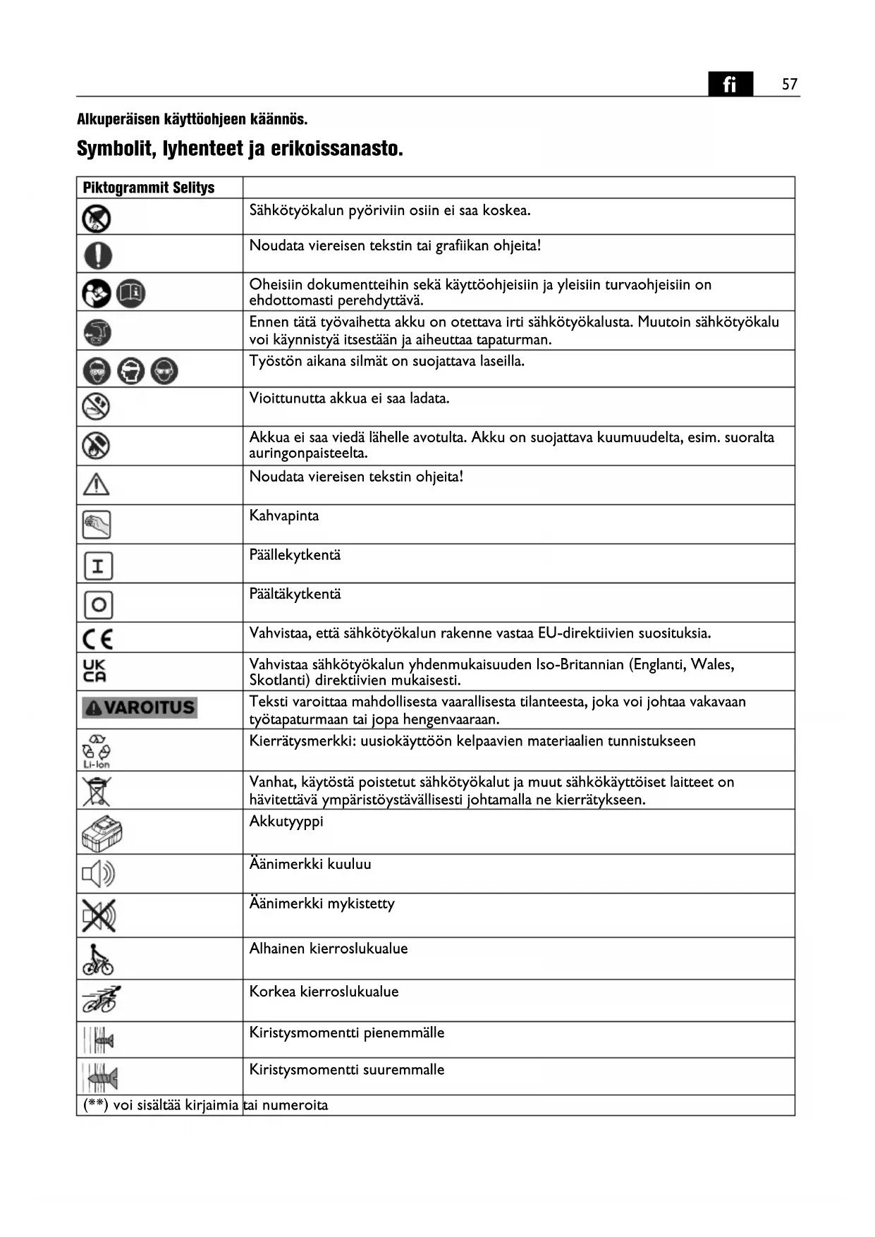 Alkuperäisen käyttöohjeen käännös. Symbolit, lyhenteet ja erikoissanasto. Piktogrammit Selitys Sähkötyökalun pyöriviin osiin ei saa koskea. Noudata viereisen tekstin tai grafiikan ohjeita! Oheisiin dokumentteihin sekä käyttöohjeisiin ja yleisiin turvaohjeisiin on ehdottomasti perehdyttävä. Ennen tätä työvaihetta akku on otettava irti sähkötyökalusta. Muutoin sähkötyökalu voi käynnistyä itsestään ja aiheuttaa tapaturman. Työstön aikana silmät on suojattava laseilla. Vioittunutta akkua ei saa ladata. Akkua ei saa viedä lähelle avotulta. Akku on suojattava kuumuudelta, esim. suoralta auringonpaisteelta. Noudata viereisen tekstin ohjeita! Kahvapinta Päällekytkentä Päältäkytkentä Vahvistaa, että sähkötyökalun rakenne vastaa EU-direktiivien suosituksia. Vahvistaa sähkötyökalun yhdenmukaisuuden Iso-Britannian (Englanti, Wales, Skotlanti) direktiivien mukaisesti. Teksti varoittaa mahdollisesta vaarallisesta tilanteesta, joka voi johtaa vakavaan työtapaturmaan tai jopa hengenvaaraan. Kierrätysmerkki: uusiokäyttöön kelpaavien materiaalien tunnistukseen Vanhat, käytöstä poistetut sähkötyökalut ja muut sähkökäyttöiset laitteet on hävitettävä ympäristöystävällisesti johtamalla ne kierrätykseen. Akkutyyppi Äänimerkki kuuluu Äänimerkki mykistetty Alhainen kierroslukualue Korkea kierroslukualue Kiristysmomentti pienemmälle Kiristysmomentti suuremmalle (**) voi sisältää kirjaimia tai numeroita58