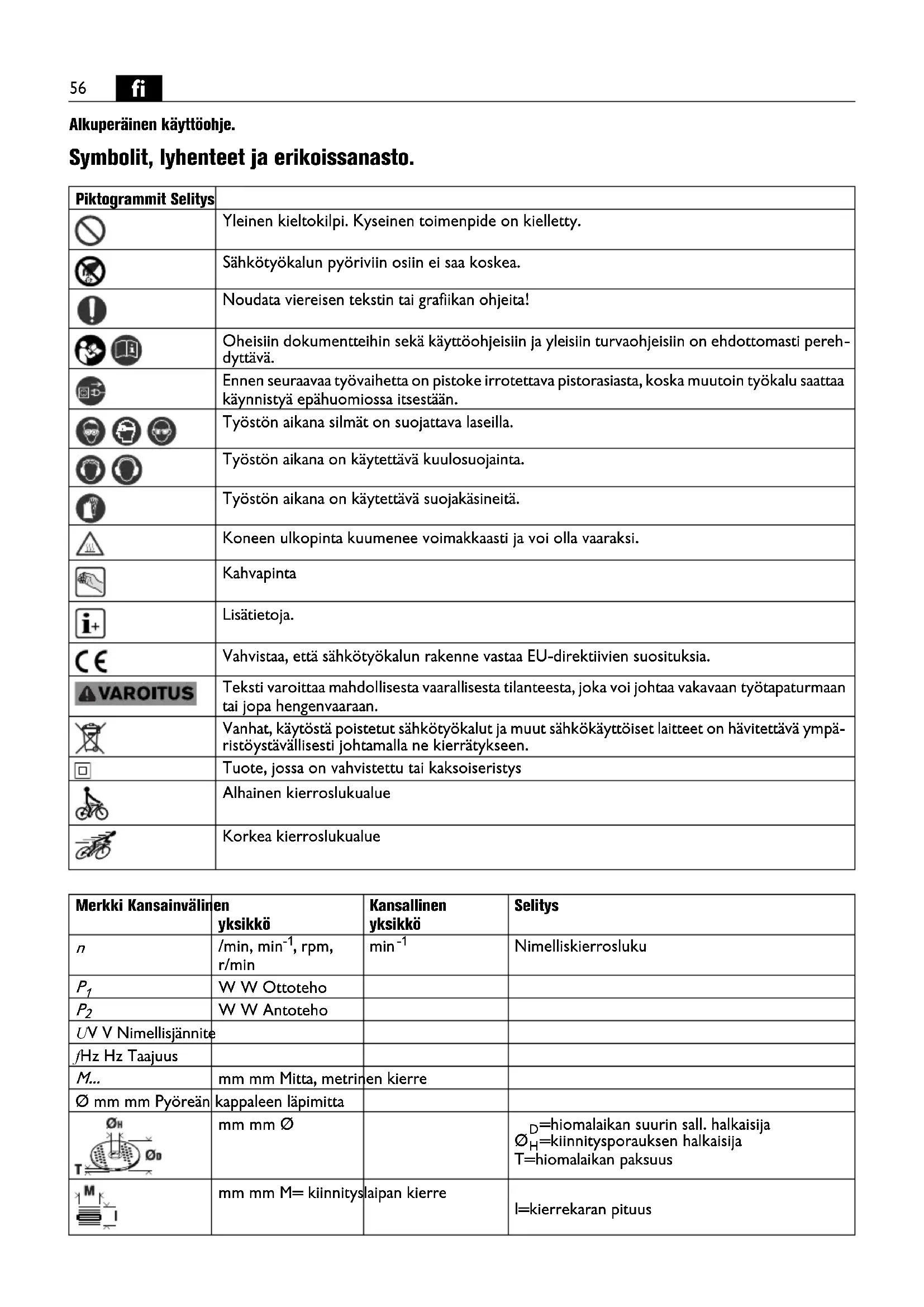 Alkuperäinen käyttöohje. Symbolit, lyhenteet ja erikoissanasto. Piktogrammit Selitys Yleinen kieltokilpi. Kyseinen toimenpide on kielletty. Sähkötyökalun pyöriviin osiin ei saa koskea. Noudata viereisen tekstin tai grafiikan ohjeita! Oheisiin dokumentteihin sekä käyttöohjeisiin ja yleisiin turvaohjeisiin on ehdottomasti pereh- dyttävä. Ennen seuraavaa työvaihetta on pistoke irrotettava pistorasiasta, koska muutoin työkalu saattaa käynnistyä epähuomiossa itsestään. Työstön aikana silmät on suojattava laseilla. Työstön aikana on käytettävä kuulosuojainta. Työstön aikana on käytettävä suojakäsineitä. Koneen ulkopinta kuumenee voimakkaasti ja voi olla vaaraksi. Kahvapinta Lisätietoja. Vahvistaa, että sähkötyökalun rakenne vastaa EU-direktiivien suosituksia. Teksti varoittaa mahdollisesta vaarallisesta tilanteesta, joka voi johtaa vakavaan työtapaturmaan tai jopa hengenvaaraan. Vanhat, käytöstä poistetut sähkötyökalut ja muut sähkökäyttöiset laitteet on hävitettävä ympä- ristöystävällisesti johtamalla ne kierrätykseen. Tuote, jossa on vahvistettu tai kaksoiseristys Alhainen kierroslukualue Korkea kierroslukualue Merkki Kansainvälinen yksikkö Kansallinen yksikkö Selitys