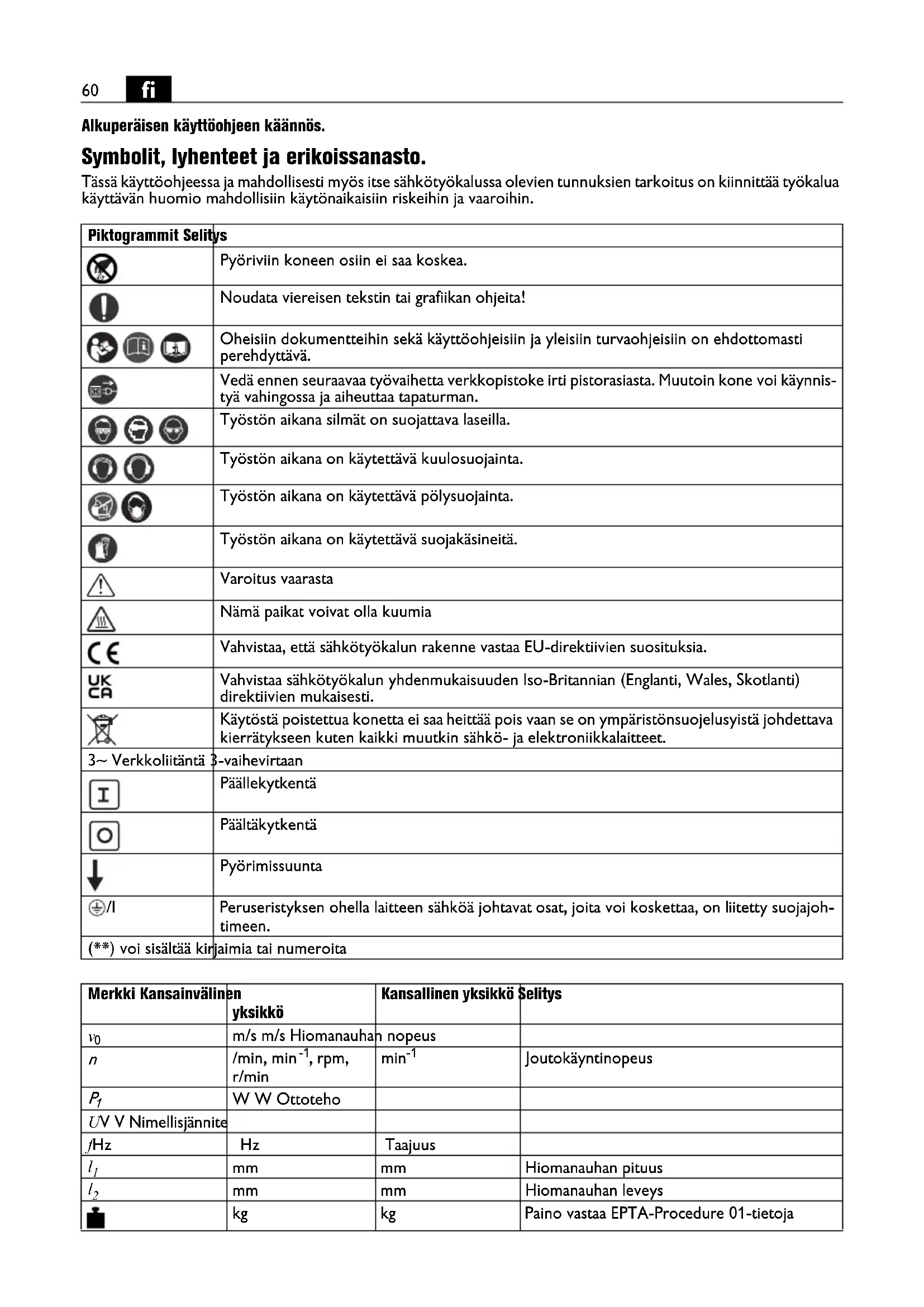 Alkuperäisen käyttöohjeen käännös. Symbolit, lyhenteet ja erikoissanasto. Tässä käyttöohjeessa ja mahdollisesti myös itse sähkötyökalussa olevien tunnuksien tarkoitus on kiinnittää työkalua käyttävän huomio mahdollisiin käytönaikaisiin riskeihin ja vaaroihin. Piktogrammit Selitys Pyöriviin koneen osiin ei saa koskea. Noudata viereisen tekstin tai grafiikan ohjeita! Oheisiin dokumentteihin sekä käyttöohjeisiin ja yleisiin turvaohjeisiin on ehdottomasti perehdyttävä. Vedä ennen seuraavaa työvaihetta verkkopistoke irti pistorasiasta. Muutoin kone voi käynnis- tyä vahingossa ja aiheuttaa tapaturman. Työstön aikana silmät on suojattava laseilla. Työstön aikana on käytettävä kuulosuojainta. Työstön aikana on käytettävä pölysuojainta. Työstön aikana on käytettävä suojakäsineitä. Varoitus vaarasta Nämä paikat voivat olla kuumia Vahvistaa, että sähkötyökalun rakenne vastaa EU-direktiivien suosituksia. Vahvistaa sähkötyökalun yhdenmukaisuuden Iso-Britannian (Englanti, Wales, Skotlanti) direktiivien mukaisesti. Käytöstä poistettua konetta ei saa heittää pois vaan se on ympäristönsuojelusyistä johdettava kierrätykseen kuten kaikki muutkin sähkö- ja elektroniikkalaitteet. 3~ Verkkoliitäntä 3-vaihevirtaan Päällekytkentä Päältäkytkentä Pyörimissuunta /I Peruseristyksen ohella laitteen sähköä johtavat osat, joita voi koskettaa, on liitetty suojajoh- timeen. (**) voi sisältää kirjaimia tai numeroita Merkki Kansainvälinen yksikkö Kansallinen yksikkö Selitys