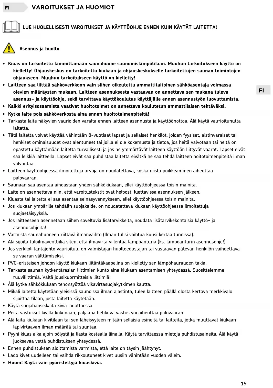 - Yleisissä saunoissa, joissa kiuasta käytetään ilman ajastinta tai yhtäjaksoisesti pidempiä aikoja kuin kiukaan tai ohjauslaitteen ajastin tehdasasetuksilla sallii, tulee laitetta valvoa jatkuvasti.