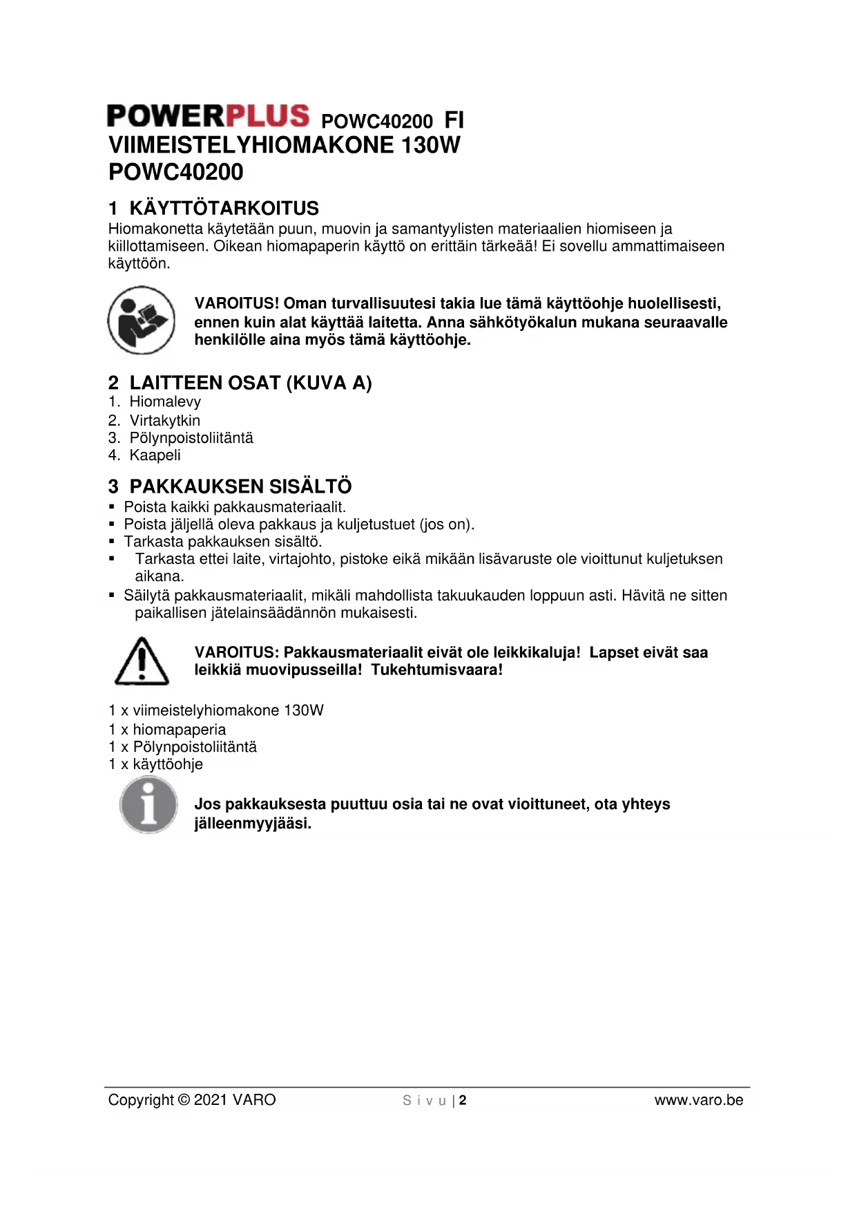 VAROITUS! Oman turvallisuutesi takia lue tamä kayttöohje huolellisesti, ennen kuin alat kayttäa laitetta. Anna sahkötyokalun mukana seuraavalle henkilolle aina myös tamä kayttöohje.