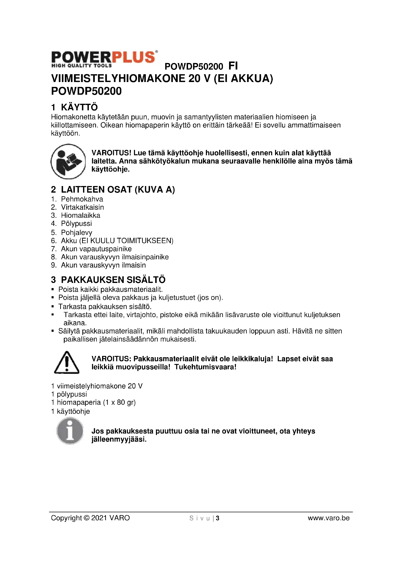 VAROITUS! Lue tämä käyttoohje huolellisesti, ennen kuin alat käyttaa laitetta. Anna sahkötyokalun mukana seuraavalle henkilolle aina myös tämä käyttoohje.
