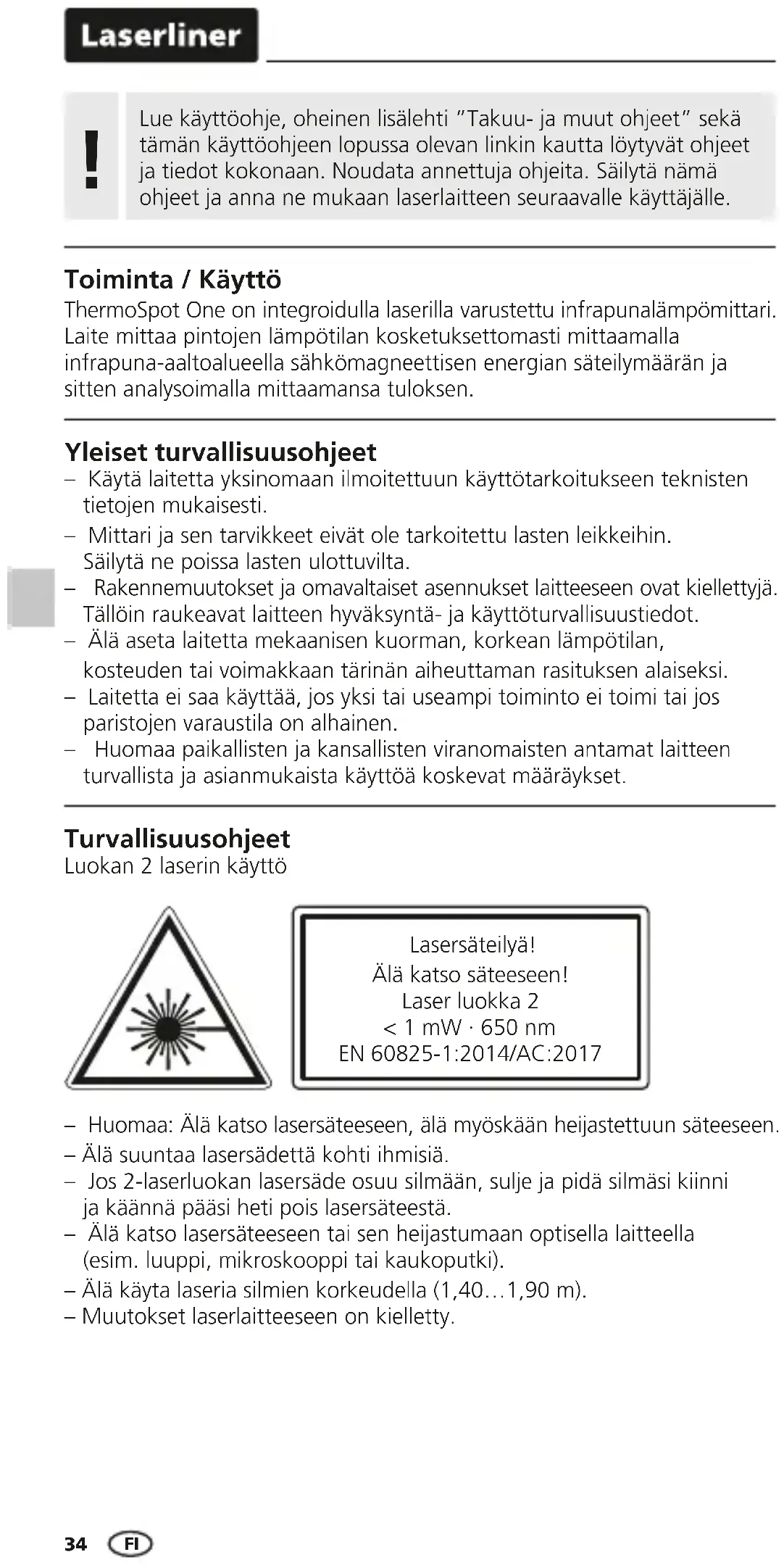 Toiminta / Käyttö ThermoSpot One on integroidulla laserilla varustettu infrapunalämpömittari. Laite mittaa pintojen lämpötilan kosketuksettomasti mittaamalla infrapuna-aaltoalueella sähkömagneettisen energian säteilymäärän ja sitten analysoimalla mittaamansa tuloksen. – Huomaa: Älä katso lasersäteeseen, älä myöskään heijastettuun säteeseen. – Älä suuntaa lasersädettä kohti ihmisiä. – Jos 2-laserluokan lasersäde osuu silmään, sulje ja pidä silmäsi kiinni ja käännä pääsi heti pois lasersäteestä. – Älä katso lasersäteeseen tai sen heijastumaan optisella laitteella (esim. luuppi, mikroskooppi tai kaukoputki). – Älä käyta laseria silmien korkeudella (1,40…1,90 m). – Muutokset laserlaitteeseen on kielletty. Turvallisuusohjeet Luokan 2 laserin käyttö Yleiset turvallisuusohjeet – Käytä laitetta yksinomaan ilmoitettuun käyttötarkoitukseen teknisten tietojen mukaisesti. – Mittari ja sen tarvikkeet eivät ole tarkoitettu lasten leikkeihin. Säilytä ne poissa lasten ulottuvilta. – Rakennemuutokset ja omavaltaiset asennukset laitteeseen ovat kiellettyjä. Tällöin raukeavat laitteen hyväksyntä- ja käyttöturvallisuustiedot. – Älä aseta laitetta mekaanisen kuorman, korkean lämpötilan, kosteuden tai voimakkaan tärinän aiheuttaman rasituksen alaiseksi. – Laitetta ei saa käyttää, jos yksi tai useampi toiminto ei toimi tai jos paristojen varaustila on alhainen. – Huomaa paikallisten ja kansallisten viranomaisten antamat laitteen turvallista ja asianmukaista käyttöä koskevat määräykset. Lue käyttöohje, oheinen lisälehti ”Takuu- ja muut ohjeet” sekä tämän käyttöohjeen lopussa olevan linkin kautta löytyvät ohjeet ja tiedot kokonaan. Noudata annettuja ohjeita. Säilytä nämä ohjeet ja anna ne mukaan laserlaitteen seuraavalle käyttäjälle.
