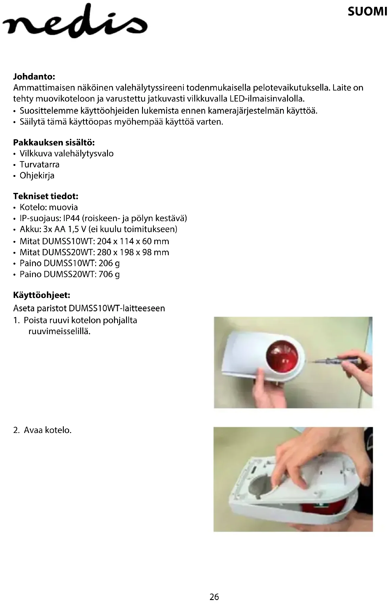 - Lisätietoja antaa jälleenmyyjä tai paikallinen jätehuollosta vastaava viranomainen. Tämä tuote on valmistettu ja toimitettu noudattaen kaikkia sitä koskevia asetuksia ja direktiivejä, jotka ovat voimassa kaikissa Euroopan unionin jäsenvaltioissa. Se täyttää myös kaikki myyntimaassa sovellettavat vaatimukset ja määräykset. Viralliset asiakirjat ovat saatavilla pyynnöstä. Asiakirjoihin sisältyvät seuraavat, mutta näihin rajoittumatta: Vaatimustenmukaisuusvakuutus (ja tuotteen tunniste), käyttöturvallisuustiedote, tuotteen testiraportti. Saat neuvoja ottamalla yhteyttä asiakaspalveluumme: verkkosivun kautta: http://www.nedis./-/ota-yhteytta/yhteyslomake.htm sähköpostilla: service@nedis.com puhelimitse: +31 (0)73-5991055 (toimistoaikoina) NEDIS B.V., De Tweeling 28, 5215 MC ’s-Hertogenbosch, ALANKOMAAT29 SVENSKA Introduktion: Prosig attrapp larmsiren med en avskräckande eekt. Tillverkad av ett plasthölje och försedd med en kontinuerligt blinkande LED-indikator.