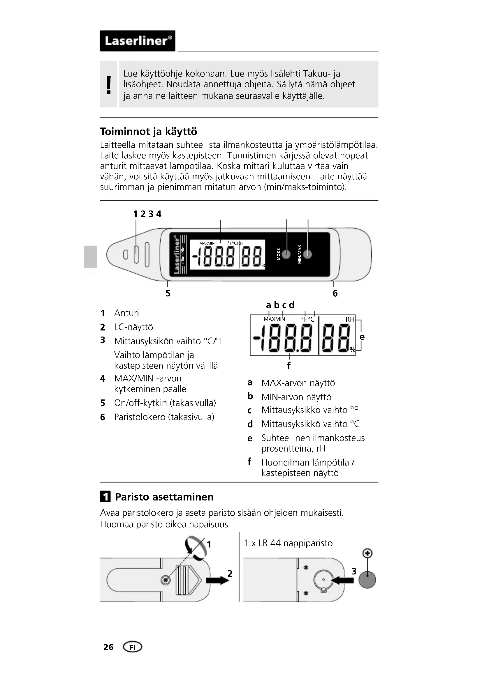 Paristo asettaminen Avaa paristolokero ja aseta paristo sisään ohjeiden mukaisesti. Huomaa paristo oikea napaisuus. 1 x LR 44 nappiparisto FIClimaPilot