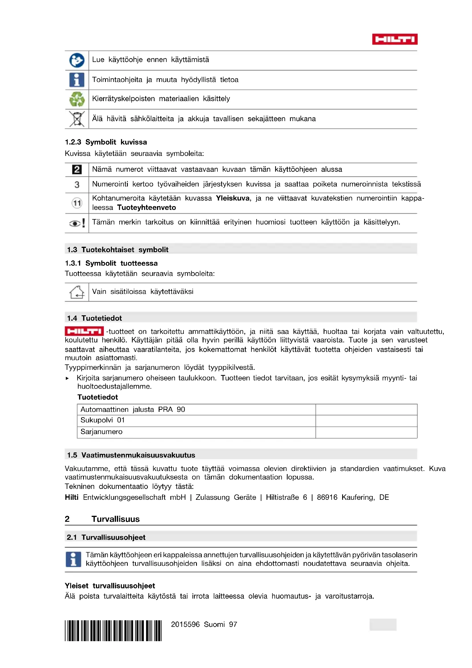 Vakuutamme, että tässä kuvattu tuote täyttää voimassa olevien direktiivien ja standardien vaatimukset. Kuva vaatimustenmukaisuusvakuutuksesta on tämän dokumentaation lopussa. Tekninen dokumentaatio löytyy tästä: Hilti Entwicklungsgesellschaft mbH | Zulassung Geräte | Hiltistraße 6 | 86916 Kaufering, DE 2 Turvallisuus