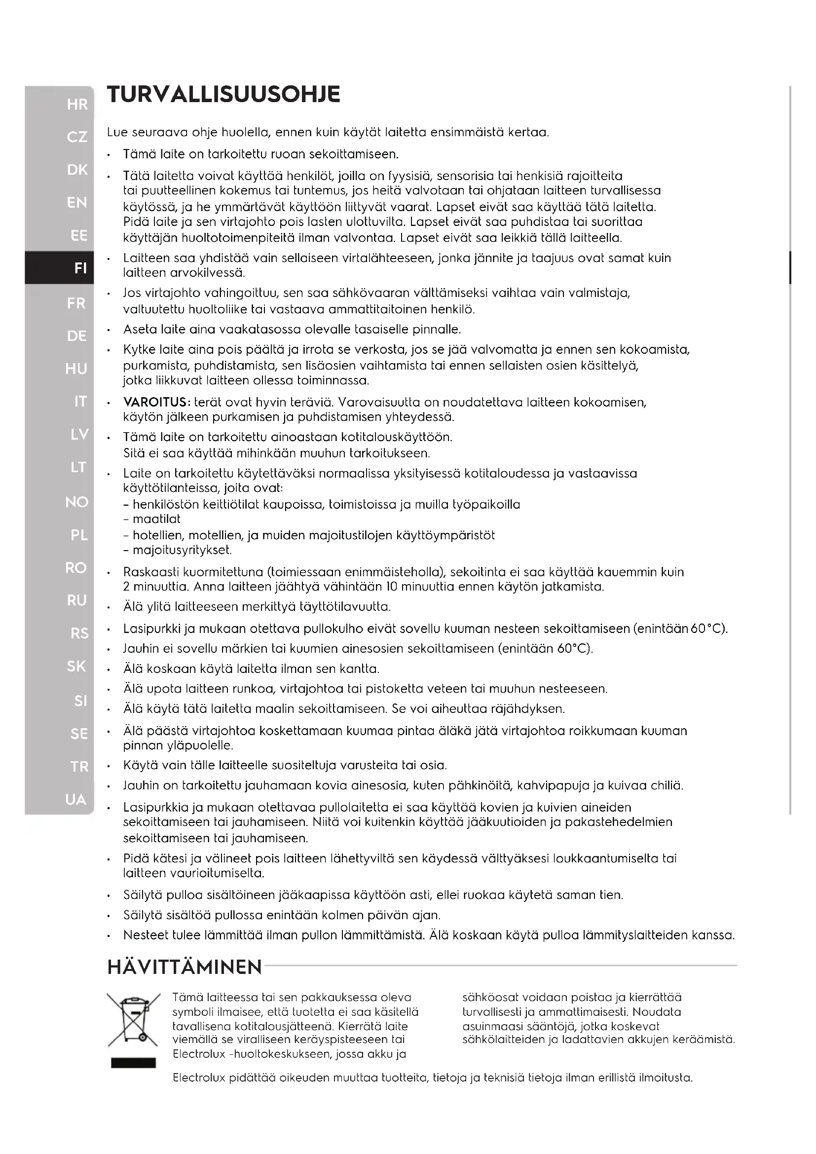 Electrolux pidättää oikeuden muuttaa tuotteita, tietoja ja teknisiä tietoja ilman erillistä ilmoitusta. Tämä laitteessa tai sen pakkauksessa oleva symboli ilmaisee, että tuotetta ei saa käsitellä tavallisena kotitalousjätteenä. Kierrätä laite viemällä se viralliseen keräyspisteeseen tai Electrolux -huoltokeskukseen, jossa akku ja sähköosat voidaan poistaa ja kierrättää turvallisesti ja ammattimaisesti. Noudata asuinmaasi sääntöjä, jotka koskevat sähkölaitteiden ja ladattavien akkujen keräämistä.HR