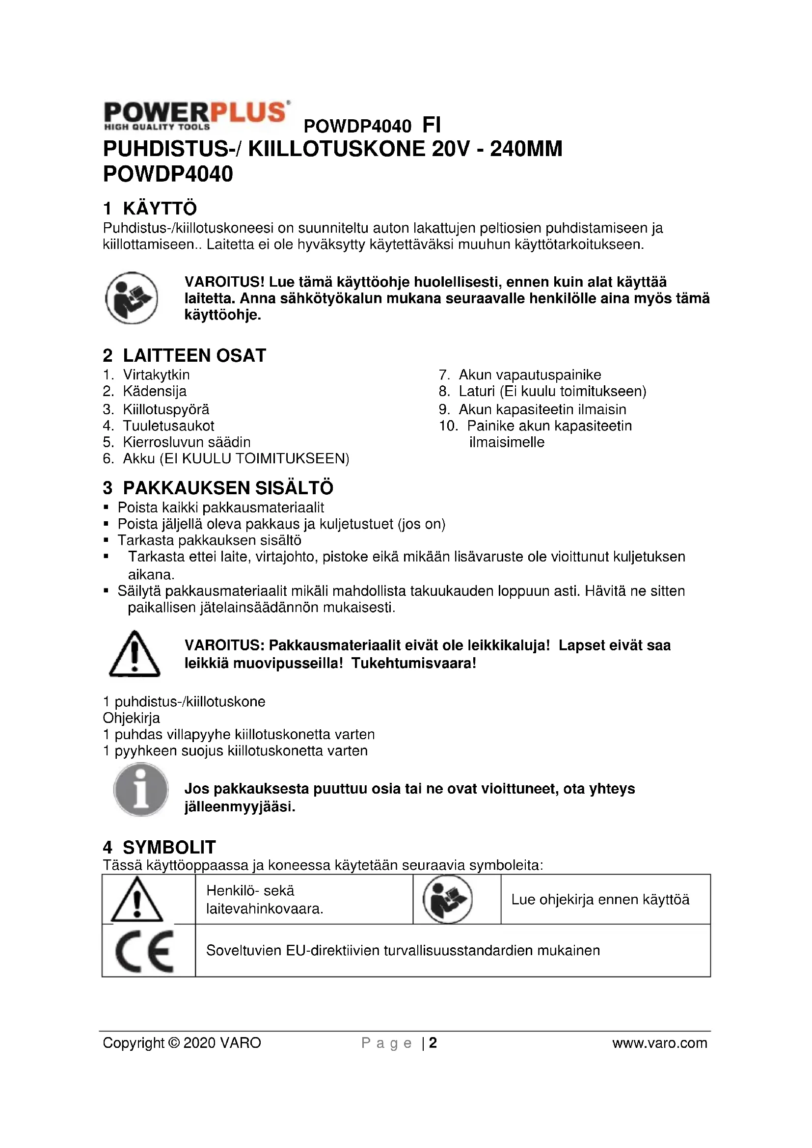 Paino 2.4kg Koko Ø240mm 12 MELU Melupäästöjen arvot on mitattu asianmukaisen standardin mukaan. (K=3) Äänenpainetaso LpA 81 dB(A) Äänitehotaso LwA 92 dB(A) HUOMIO! Käytä kuulosuojaimia, kun äänenpaine on yli 85 dB(A). aw (Tärinätaso): 6,1 m/s² K = 1.5 m/s²POWDP4040 FI Copyright © 2020 VARO P a g e | 8 www.varo.com 13 HUOLTO Laite ei tarvitse erityistä huoltoa. Puhdista tuuletusaukot säännöllisesti. Pese kiillotuspäällys säännöllisesti ja ainoastaan käsin. Anna kiillotuspäällysten kuivua ilmassa. Jos et käytä konetta pitkään aikaan, irrota kiillotuspäällys kiillotuspyörästä. Säilytä konetta kiillotuspyörä ylöspäin suunnattuna. 14 TAKUU Tälle tuotteelle on annettu 36 kuukauden takuu, joka alkaa hankintapäivämäärästä, jolloin ensimmäinen käyttäjä on ostanut tuotteen. Takuu kattaa kaikki materiaali- tai valmistusviat, mutta ei kata: akkuja, latureita normaalista osien kulumisesta johtuvia vikoja, kuten laakereita, harjoja, kaapeleita, tulppia tai lisävarusteita kuten poria, poran teriä, sahan teriä jne.; vahinkoja tai vikoja, jotka johtuvat väärinkäytöstä, onnettomuuksista tai tuotteeseen tehdyistä muutoksista; eikä myöskään kuljetuskustannuksia. Väärästä käytöstä johtuvat viat ja/tai vauriot eivät myöskään kuulu takuun piiriin. Pidätämme myös itsellämme oikeuden hylätä vaatimus, joka koskee työkalun väärästä käytöstä aiheutunutta ruumiillista vammaa. Korjaukset saa suorittaa vain Powerplus työkalujen valtuuttamassa huoltopisteessä. Lisätietoja saat tarvittaessa puhelinnumerosta 00 32 3 292 92 90. Asiakas vastaa myös mahdollisista kuljetuskustannuksista, ellei ole kirjallisesti toisin sovittu. Samanaikaisesti mitään vaatimuksia ei voida tehdä takuuseen, jos laitteessa ilmenevä vika on seurausta laiminlyödystä huollosta tai ylikuormituksesta. Takuun piiriin eivät kuulu viat, jotka johtuvat nesteen tunkeutumisesta laitteeseen, liiallisesta pölystä, tahallisesti aiheutetusta viasta (tahallisesta toiminnasta tai huolimattomuudesta johtuen), väärästä käytöstä (laitteelle sopimattomat käyttötarkoitukset), taitamattomasta käytöstä (esim. käsikirjan ohjeita ei noudateta), väärästä kokoamisesta, salaman iskusta, virheellisestä verkkojännitteestä. Tämä lista ei ole rajoittava. Vaatimusten hyväksyminen takuun piiriin kuuluvana ei voi koskaan johtaa takuukauden pidentämiseen eikä uuden takuukauden alkamiseen, jos laite joudutaan vaihtamaan uuteen. Laitteet tai osat jotka on vaihdettu takuun piiriin kuuluvana, ovat Varo NV:n omaisuutta. Pidätämme itsellämme oikeuden hylätä vaatimukset, jos hankintaa ei voida tarkistaa tai jos on ilmeistä, ettei tuotetta ei ole huollettu asianmukaisesti. (ilmanottoaukkojen puhdistus, hiiliharjojen säännöllinen huolto,…) Säilytä kassakuitti ostopäivämäärän tositteena. Työkalu on palautettava purkamattomana jälleenmyyjälle hyväksyttävän puhtaassa kunnossa, alkuperäisessä muotoillussa laatikossaan (mikäli käytettävissä tälle yksikölle) ostotositteen kera. Työkalusi on ladattava vähintään kerran kuukaudessa, jotta voidaan varmistaa tämän työkalun optimaalinen käyttö.