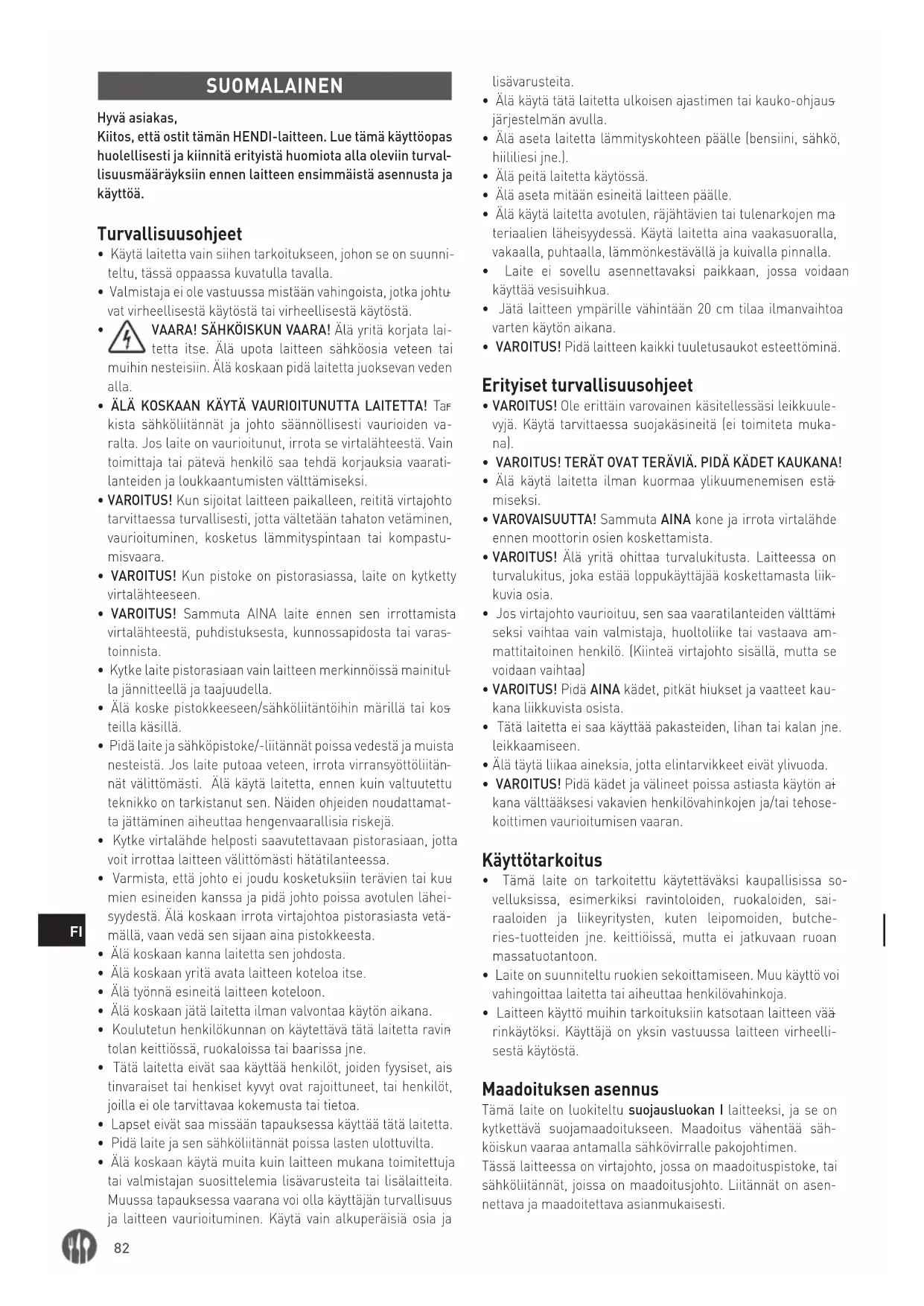 SUOMALAINEN Hyvä asiakas, Kiitos, että ostit tämän HENDI-laitteen. Lue tämä käyttöopas huolellisesti ja kiinnitä erityistä huomiota alla oleviin turval