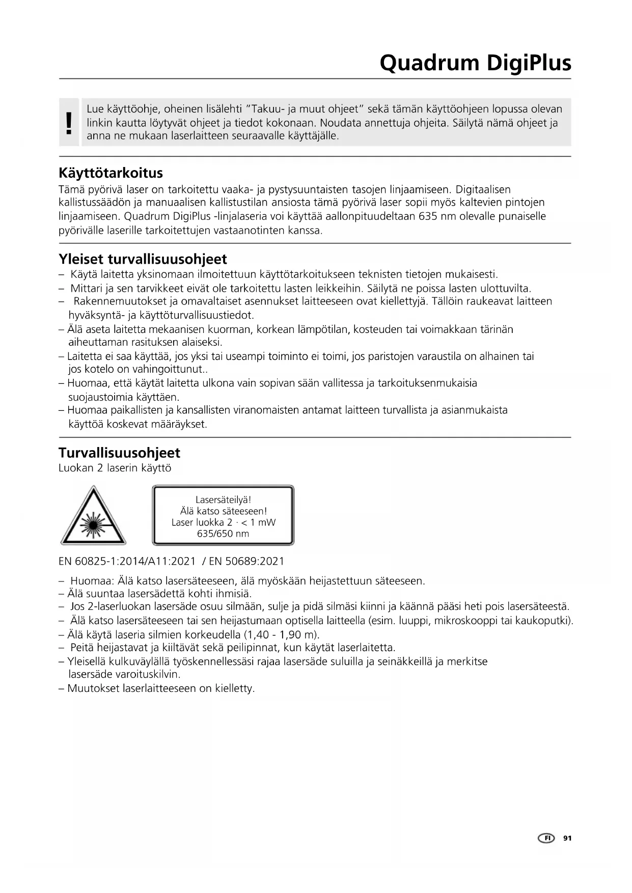 Käyttötarkoitus Tämä pyörivä laser on tarkoitettu vaaka- ja pystysuuntaisten tasojen linjaamiseen. Digitaalisen kallistussäädön ja manuaalisen kallistustilan ansiosta tämä pyörivä laser sopii myös kaltevien pintojen linjaamiseen. Quadrum DigiPlus -linjalaseria voi käyttää aallonpituudeltaan 635 nm olevalle punaiselle pyörivälle laserille tarkoitettujen vastaanotinten kanssa. Yleiset turvallisuusohjeet – Käytä laitetta yksinomaan ilmoitettuun käyttötarkoitukseen teknisten tietojen mukaisesti. – Mittari ja sen tarvikkeet eivät ole tarkoitettu lasten leikkeihin. Säilytä ne poissa lasten ulottuvilta. – Rakennemuutokset ja omavaltaiset asennukset laitteeseen ovat kiellettyjä. Tällöin raukeavat laitteen hyväksyntä- ja käyttöturvallisuustiedot. – Älä aseta laitetta mekaanisen kuorman, korkean lämpötilan, kosteuden tai voimakkaan tärinän aiheuttaman rasituksen alaiseksi. – Laitetta ei saa käyttää, jos yksi tai useampi toiminto ei toimi, jos paristojen varaustila on alhainen tai jos kotelo on vahingoittunut.. – Huomaa, että käytät laitetta ulkona vain sopivan sään vallitessa ja tarkoituksenmukaisia suojaustoimia käyttäen. – Huomaa paikallisten ja kansallisten viranomaisten antamat laitteen turvallista ja asianmukaista käyttöä koskevat määräykset. EN 60825-1:2014/A11:2021 / EN 50689:2021 Turvallisuusohjeet Luokan 2 laserin käyttö – Huomaa: Älä katso lasersäteeseen, älä myöskään heijastettuun säteeseen. – Älä suuntaa lasersädettä kohti ihmisiä. – Jos 2-laserluokan lasersäde osuu silmään, sulje ja pidä silmäsi kiinni ja käännä pääsi heti pois lasersäteestä. – Älä katso lasersäteeseen tai sen heijastumaan optisella laitteella (esim. luuppi, mikroskooppi tai kaukoputki). – Älä käytä laseria silmien korkeudella (1,40 - 1,90 m). – Peitä heijastavat ja kiiltävät sekä peilipinnat, kun käytät laserlaitetta. – Yleisellä kulkuväylällä työskennellessäsi rajaa lasersäde suluilla ja seinäkkeillä ja merkitse lasersäde varoituskilvin. – Muutokset laserlaitteeseen on kielletty. Lasersäteilyä! Älä katso säteeseen! Laser luokka 2 · < 1 mW 635/650 nm92