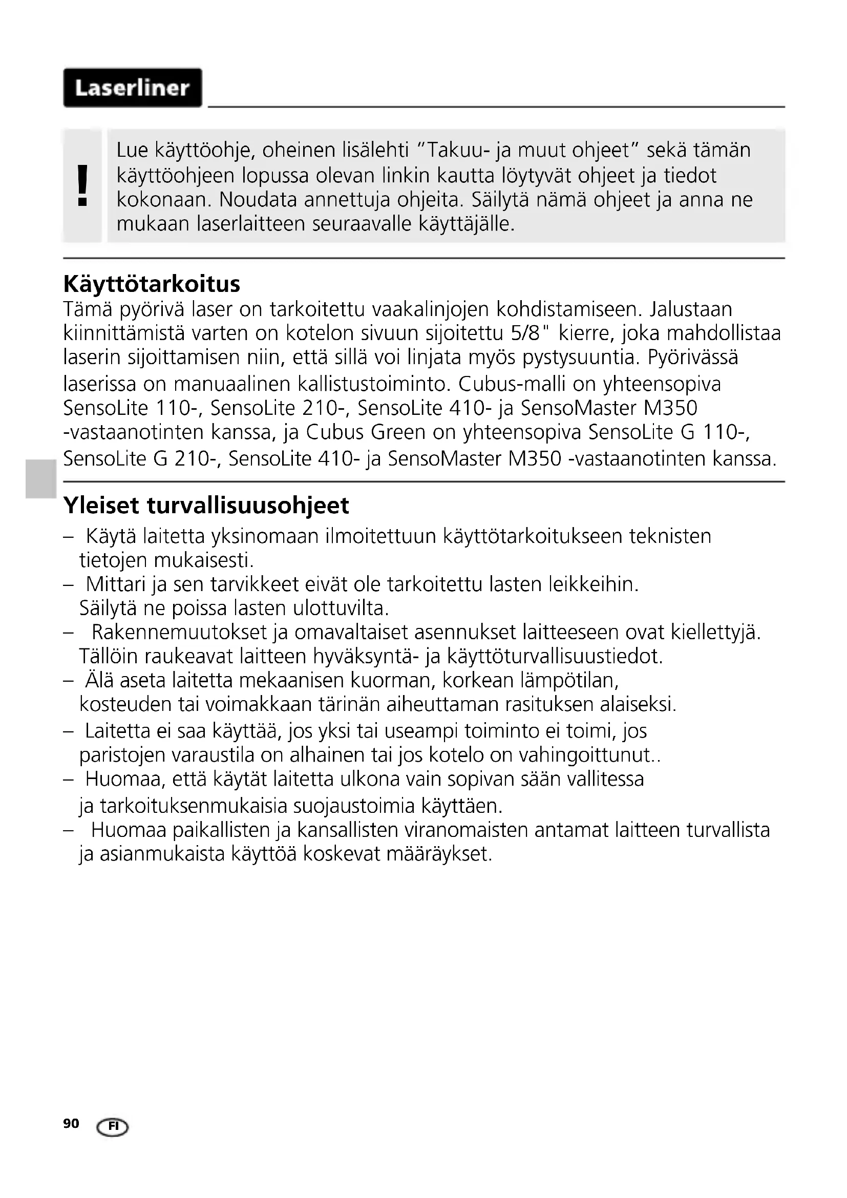 Yleiset turvallisuusohjeet – Käytä laitetta yksinomaan ilmoitettuun käyttötarkoitukseen teknisten tietojen mukaisesti. – Mittari ja sen tarvikkeet eivät ole tarkoitettu lasten leikkeihin. Säilytä ne poissa lasten ulottuvilta. – Rakennemuutokset ja omavaltaiset asennukset laitteeseen ovat kiellettyjä. Tällöin raukeavat laitteen hyväksyntä- ja käyttöturvallisuustiedot. – Älä aseta laitetta mekaanisen kuorman, korkean lämpötilan, kosteuden tai voimakkaan tärinän aiheuttaman rasituksen alaiseksi. – Laitetta ei saa käyttää, jos yksi tai useampi toiminto ei toimi, jos paristojen varaustila on alhainen tai jos kotelo on vahingoittunut.. – Huomaa, että käytät laitetta ulkona vain sopivan sään vallitessa ja tarkoituksenmukaisia suojaustoimia käyttäen. – Huomaa paikallisten ja kansallisten viranomaisten antamat laitteen turvallista ja asianmukaista käyttöä koskevat määräykset. Käyttötarkoitus Tämä pyörivä laser on tarkoitettu vaakalinjojen kohdistamiseen. Jalustaan kiinnittämistä varten on kotelon sivuun sijoitettu 5/8" kierre, joka mahdollistaa laserin sijoittamisen niin, että sillä voi linjata myös pystysuuntia. Pyörivässä laserissa on manuaalinen kallistustoiminto. Cubus-malli on yhteensopiva SensoLite 110-, SensoLite 210-, SensoLite 410- ja SensoMaster M350 -vastaanotinten kanssa, ja Cubus Green on yhteensopiva SensoLite G 110-, SensoLite G 210-, SensoLite 410- ja SensoMaster M350 -vastaanotinten kanssa. Lue käyttöohje, oheinen lisälehti ”Takuu- ja muut ohjeet” sekä tämän käyttöohjeen lopussa olevan linkin kautta löytyvät ohjeet ja tiedot kokonaan. Noudata annettuja ohjeita. Säilytä nämä ohjeet ja anna ne mukaan laserlaitteen seuraavalle käyttäjälle.