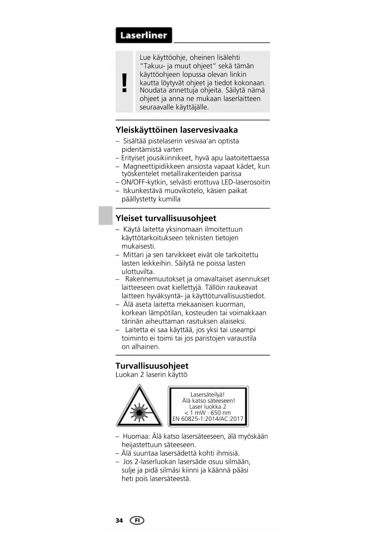 robocza maks. 4000 m nad punktem zerowym normalnym Warunki przechowywania -10°C ... 70°C, wilgotność powietrza maks. 80% wilgotności względnej Masa 130 g (z bateriami) Wymiary (szer. x wys. x gł.) 210 x 59 x 62 mm Rozdzielacz wiązki 90° pozwala na dodatkową zmianę kierunku promienia laserowego o90°. Rozdzielacz wiązki 90° (zależnie od wersji produktu) PL34 Turvallisuusohjeet Luokan 2 laserin käyttö Lasersäteilyä! Älä katso säteeseen! Laser luokka 2 < 1 mW · 650 nm EN 60825-1:2014/AC:2017 – Huomaa: Älä katso lasersäteeseen, älä myöskään heijastettuun säteeseen. – Älä suuntaa lasersädettä kohti ihmisiä. – Jos 2-laserluokan lasersäde osuu silmään, sulje ja pidä silmäsi kiinni ja käännä pääsi heti pois lasersäteestä. Yleiset turvallisuusohjeet – Käytä laitetta yksinomaan ilmoitettuun käyttötarkoitukseen teknisten tietojen mukaisesti. – Mittari ja sen tarvikkeet eivät ole tarkoitettu lasten leikkeihin. Säilytä ne poissa lasten ulottuvilta. – Rakennemuutokset ja omavaltaiset asennukset laitteeseen ovat kiellettyjä. Tällöin raukeavat laitteen hyväksyntä- ja käyttöturvallisuustiedot. – Älä aseta laitetta mekaanisen kuorman, korkean lämpötilan, kosteuden tai voimakkaan tärinän aiheuttaman rasituksen alaiseksi. – Laitetta ei saa käyttää, jos yksi tai useampi toiminto ei toimi tai jos paristojen varaustila on alhainen. – Sisältää pistelaserin vesivaa’an optista pidentämistä varten – Erityiset jousikiinnikeet, hyvä apu laatoitettaessa – Magneettipidikkeen ansiosta vapaat kädet, kun työskentelet metallirakenteiden parissa – ON/OFF-kytkin, selvästi erottuva LED-laserosoitin – Iskunkestävä muovikotelo, käsien paikat päällystetty kumilla Yleiskäyttöinen laservesivaaka Lue käyttöohje, oheinen lisälehti ”Takuu- ja muut ohjeet” sekä tämän käyttöohjeen lopussa olevan linkin kautta löytyvät ohjeet ja tiedot kokonaan. Noudata annettuja ohjeita. Säilytä nämä ohjeet ja anna ne mukaan laserlaitteen seuraavalle käyttäjälle.