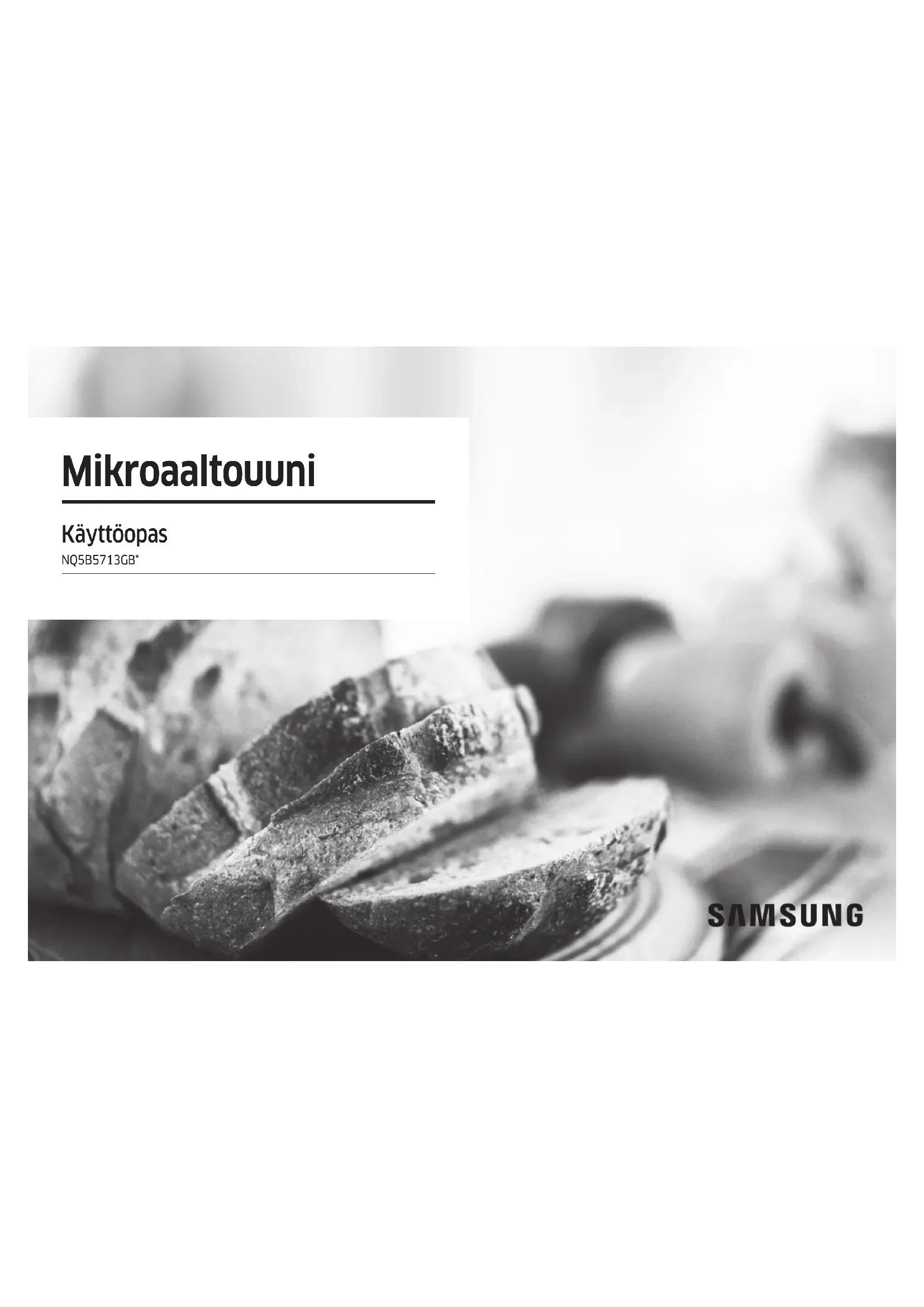 Chamada para a rede xa nacional Dias úteis das 9h às 20h www.samsung.com/pt/support SPAIN 91 175 00 15 www.samsung.com/es/support SWEDEN 0771-400 300 www.samsung.com/se/support SWITZERLAND 0800 726 786 www.samsung.com/ch/support (German) www.samsung.com/ch_fr/support (French) UK 0333 000 0333 www.samsung.com/uk/support IRELAND (EIRE) 0818 717100 www.samsung.com/ie/support DG68-01403A-03Mikroaaltouuni Käyttöopas NQ5B5713GB*2 Suomi Sisällysluettelo Sisällysluettelo Turvallisuusohjeet 3 Tärkeitä turvallisuustietoja 3 Yleinen turvallisuus 5 Mikroaaltojen käyttöön liittyviä turvallisuusohjeita 6 Rajoitettu takuu 6 Tuoteryhmän määrittely 7 Tuotteen turvallinen hävittäminen (elektroniikka ja sähkölaitteet) 7 Asentaminen 8 Pakkauksen sisältö 8 Asennusohjeet 8 Huolto 11 Puhdistaminen 11 Vaihtaminen (korjaaminen) 12 Pitkää käyttämättömänä seisottamista edeltävät suojatoimet 12 Ennen kuin aloitat 12 Käyttöpaneeli 12 Kello 13 Tietoja mikroaaltosäteilystä 13 Mikroaaltouuneille tarkoitetut valmistusastiat 14 Toiminnot 15 Yhteenveto ominaisuuksista 15 Mikroaaltouunitila 16 Automaattitila 17 Erityistoiminnot 20 Lisää toimintoja 22 Järjestelmäasetukset 22 AP Helppo asennus 23 Älykkäät valmistustoiminnot 23 Manuaalinen valmistus 23 Nopea ja helppo 29 Vianmääritys 29 Tarkistettavat kohdat 29 Näyttökoodit 34 Tekniset tiedot 34 Liite 35 Avoimen lähdekoodin ilmoitus 35Suomi 3 Turvallisuusohjeet Turvallisuusohjeet