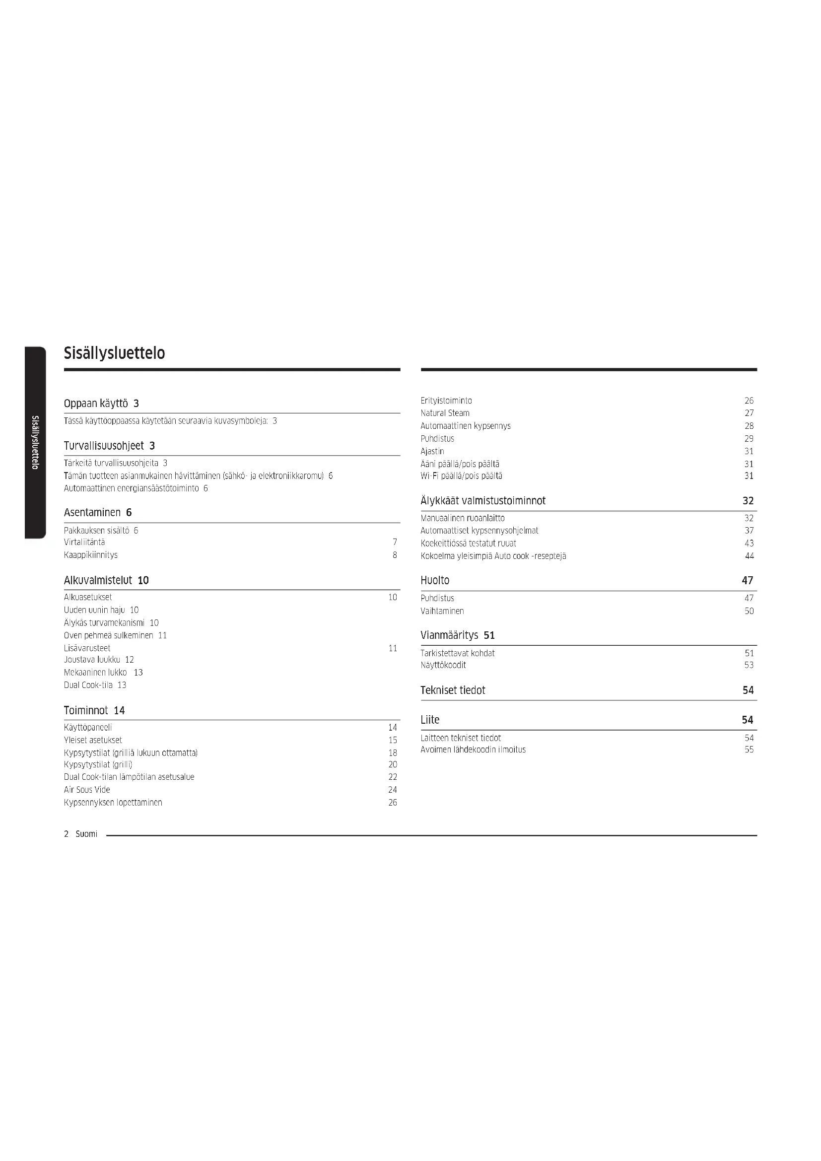 Chamada para a rede xa nacional Dias úteis das 9h às 20h www.samsung.com/pt/support SPAIN 91 175 00 15 www.samsung.com/es/support SWEDEN 0771-400 300 www.samsung.com/se/support SWITZERLAND 0800 726 786 www.samsung.com/ch/support (German) www.samsung.com/ch_fr/support (French) UK 0333 000 0333 www.samsung.com/uk/support IRELAND (EIRE) 0818 717100 www.samsung.com/ie/support DG68-01413A-02Kalusteuuni Käyttö- ja asennusohje NV7B441****/ NV7B442****/ NV7B443****/ NV7B444****/ NV7B445****/ NV7B441**C*/ NV7B442**C*/ NV7B444**C*/ NV7B451****/ NV7B452****/ NV7B453****/ NV7B454****/ NV7B455****2 Suomi Sisällysluettelo Sisällysluettelo Oppaan käyttö 3 Tässä käyttöoppaassa käytetään seuraavia kuvasymboleja: 3 Turvallisuusohjeet 3 Tärkeitä turvallisuusohjeita 3 Tämän tuotteen asianmukainen hävittäminen (sähkö- ja elektroniikkaromu) 6 Automaattinen energiansäästötoiminto 6 Asentaminen 6 Pakkauksen sisältö 6 Virtaliitäntä 7 Kaappikiinnitys 8 Alkuvalmistelut 10 Alkuasetukset 10 Uuden uunin haju 10 Älykäs turvamekanismi 10 Oven pehmeä sulkeminen 11 Lisävarusteet 11 Joustava luukku 12 Mekaaninen lukko 13 Dual Cook-tila 13 Toiminnot 14 Käyttöpaneeli 14 Yleiset asetukset 15 Kypsytystilat (grilliä lukuun ottamatta) 18 Kypsytystilat (grilli) 20 Dual Cook-tilan lämpötilan asetusalue 22 Air Sous Vide 24 Kypsennyksen lopettaminen 26 Erityistoiminto 26 Natural Steam 27 Automaattinen kypsennys 28 Puhdistus 29 Ajastin 31 Ääni päällä/pois päältä 31 Wi-Fi päällä/pois päältä 31 Älykkäät valmistustoiminnot 32 Manuaalinen ruoanlaitto 32 Automaattiset kypsennysohjelmat 37 Koekeittiössä testatut ruuat 43 Kokoelma yleisimpiä Auto cook -reseptejä 44 Huolto 47 Puhdistus 47 Vaihtaminen 50 Vianmääritys 51 Tarkistettavat kohdat 51 Näyttökoodit 53 Tekniset tiedot 54 Liite 54 Laitteen tekniset tiedot 54 Avoimen lähdekoodin ilmoitus 55Suomi 3 Oppaan käyttö Turvallisuusohjeet Tämän uunin saa asentaa vain valtuutettu sähköasentaja. Asentaja on vastuussa laitteen kytkemisestä verkkovirtaan noudattaen asianmukaisia turvallisuussuosituksia. Tärkeitä turvallisuusohjeita VAROITUS Tätä laitetta ei ole tarkoitettu sellaisten henkilöiden (mukaan lukien lapset) käyttöön, joilla on heikentyneet aistit, fyysiset, tai psyykkiset kyvyt tai joilla ei ole kokemusta tai tietoa, ellei heidän turvallisuudestaan vastaava henkilö ole valvonut tai opastanut heitä laitteen käytössä. Lapsia on valvottava, jotta he eivät leiki laitteella. Irrotuslaitteet on sisällytettävä kiinteään johdotukseen johdotussääntöjen mukaisesti. Tämä laite on kytkettävä irti verkosta asennuksen jälkeen. Kytkentä voidaan toteuttaa siten, että pistotulppa on saatavilla tai että kiinteään johdotukseen liitetään kytkin johdotussääntöjen mukaisesti. Jos verkkojohto on vaurioitunut, valmistajan, sen huoltoedustajan tai vastaavan pätevyyden omaavan henkilön on vaihdettava se vaaran välttämiseksi. Oppaan käyttö Kiitos, että valitsit Samsungin kalusteuunin. Tämä käyttöopas sisältää tärkeitä turvallisuustietoja ja ohjeita, joiden tarkoituksena on auttaa sinua laitteen käytössä ja huollossa. Lue tämä käyttöopas ennen uunin käyttöä ja säilytä tämä ohjekirja myöhempää käyttöä varten. Tässä käyttöoppaassa käytetään seuraavia kuvasymboleja: VAROITUS Vaarat tai vaaralliset käytännöt, jotka voivat aiheuttaa vakavia henkilövahinkoja, kuoleman ja/tai omaisuusvahinkoja. HUOMIO Vaarat tai vaaralliset käytännöt, jotka voivat aiheuttaa henkilövahinkoja ja/tai omaisuusvahinkoja. HUOM Hyödyllisiä vinkkejä, suosituksia tai tietoja, jotka auttavat käyttäjiä tuotteen käsittelyssä.4 Suomi Turvallisuusohjeet Turvallisuusohjeet Ilmoitettu kiinnitysmenetelmä ei saa perustua liimojen käyttöön, koska niitä ei pidetä luotettavana kiinnitysmenetelmänä. Tätä laitetta voivat käyttää vähintään 8-vuotiaat lapset ja henkilöt, joiden aistit, fyysiset, tai henkiset kyvyt ovat heikentyneet tai joilla ei ole riittävästi kokemusta tai tietoa, jos heitä on valvottu tai opastettu laitteen turvallisessa käytössä ja jos he ymmärtävät siihen liittyvät vaarat. Lapset eivät saa leikkiä laitteella. Lapset eivät saa suorittaa puhdistusta ja huoltoa ilman valvontaa. Pidä laite ja sen johto alle 8-vuotiaiden lasten ulottumattomissa. Laite kuumenee käytön aikana. On varottava koskettamasta uunin sisällä olevia lämmityselementtejä. VAROITUS: Käsiksi päästävät osat kuumenevat käytössä. Pienet lapset on pidettävä poissa. Älä käytä kovia hankaavia puhdistusaineita tai teräviä metallikaapimia uunin luukun lasin puhdistamiseen, koska ne voivat naarmuttaa pintaa, mikä voi johtaa lasin rikkoutumiseen. Jos tässä laitteessa on puhdistustoiminto, ylimääräiset roiskeet on poistettava ennen puhdistusta, eikä kaikkia astioita saa jättää uuniin höyrypuhdistuksen tai itsepuhdistuksen aikana. Puhdistustoiminto riippuu mallista. Jos tässä laitteessa on puhdistustoiminto, puhdistusolosuhteiden aikana pinnat voivat kuumentua tavallista kuumemmiksi, ja lapset on pidettävä poissa. Jotkin eläimet, erityisesti linnut, voivat olla herkkiä pyrolyyttisen puhdistusprosessin aikana syntyville höyryille ja paikallisille lämpötilan vaihteluille, ja ne olisi siirrettävä prosessin ajaksi sopivaan, hyvin tuuletettuun tilaan. Tuuleta huone pyropuhdistuksen aikana ja sen jälkeen. Puhdistustoiminto riippuu mallista. Käytä vain tähän uuniin suositeltua paistomittaria. (Vain paistomittari-malli) Höyrypuhdistinta ei saa käyttää. VAROITUS: Varmista, että laite on kytketty pois päältä ennen lampun vaihtamista, jotta vältetään sähköiskun mahdollisuus. Laitetta ei saa asentaa koristeoven taakse ylikuumenemisen välttämiseksi. VAROITUS: Laite ja sen käytettävissä olevat osat kuumenevat käytön aikana. On varottava koskemasta lämmityselementteihin. Alle 8-vuotiaat lapset on pidettävä poissa, ellei heitä jatkuvasti