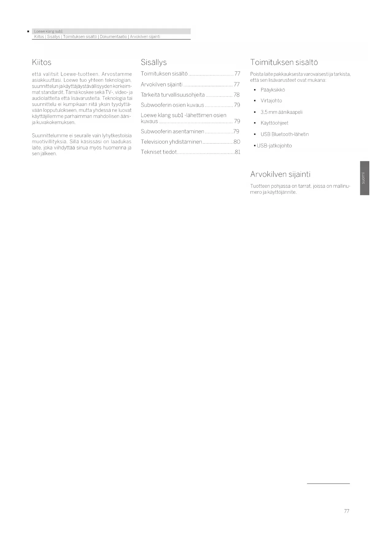 etta valitsit Loewe-tuotteen. Arvostamme asiakkuuttasi. Loewe tuo yhteen tekologian, suunnittelun ja kayttajystavallisyyden korkeimmat standardit. Tama koskee sekTV-, video-ja audiolaitteita etta lisavarusteita. Tekologia tai suunnittelu ei kumpikaan rila yksin lydyttavaan lopputulokseen, mutta yhdessa ne luovat kayttajillemme parhaimman mahdollisen aanija kuvakokemuksen.