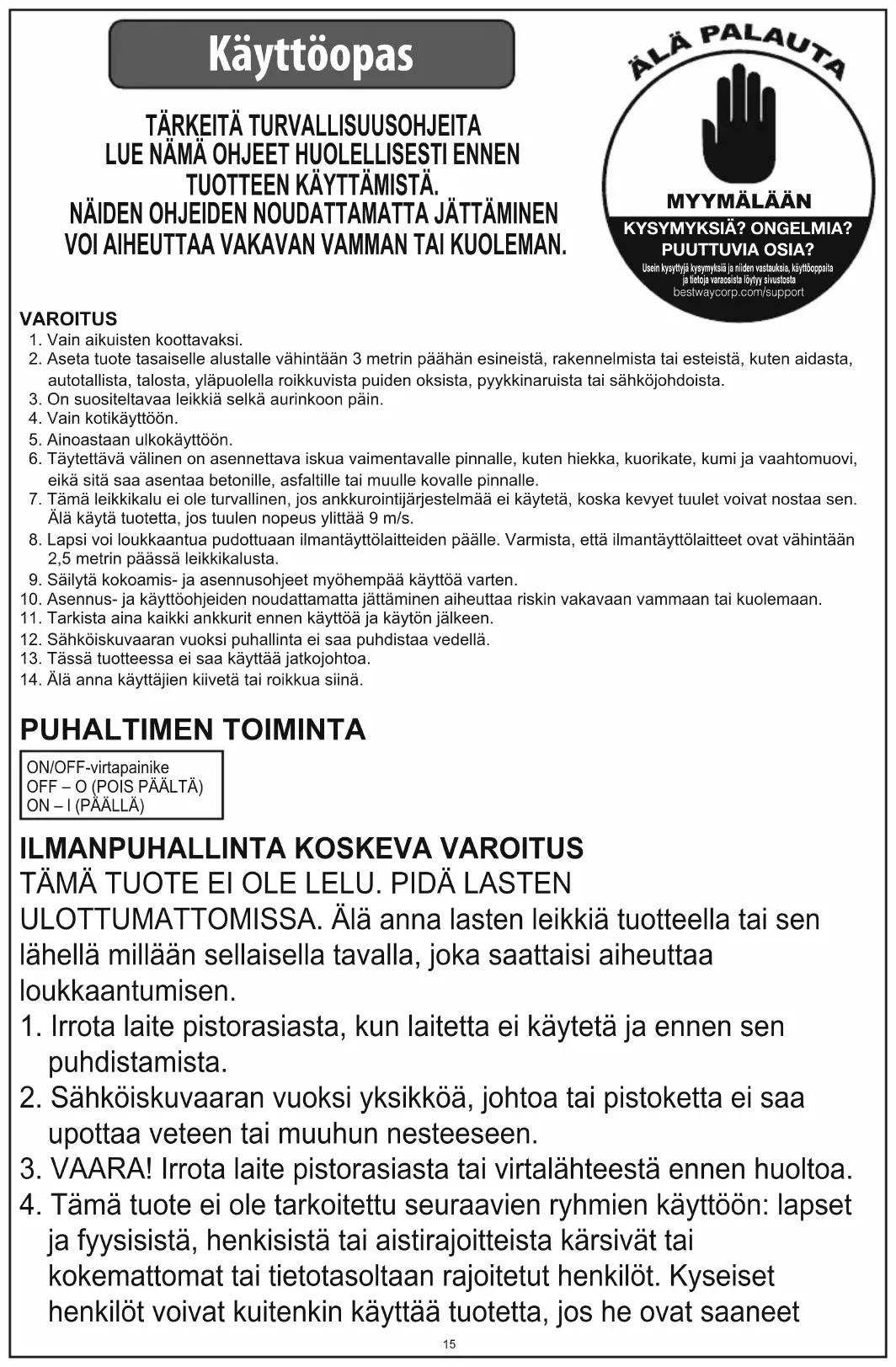 KYSYMYKSIÄ? ONGELMIA?PUUTTUVIA OSIA?Usein kysyttyjä kysymyksiä ja niiden vastauksia, käyttöoppaita ja tietoja varaosista löytyy sivustosta bestwaycorp.com/support