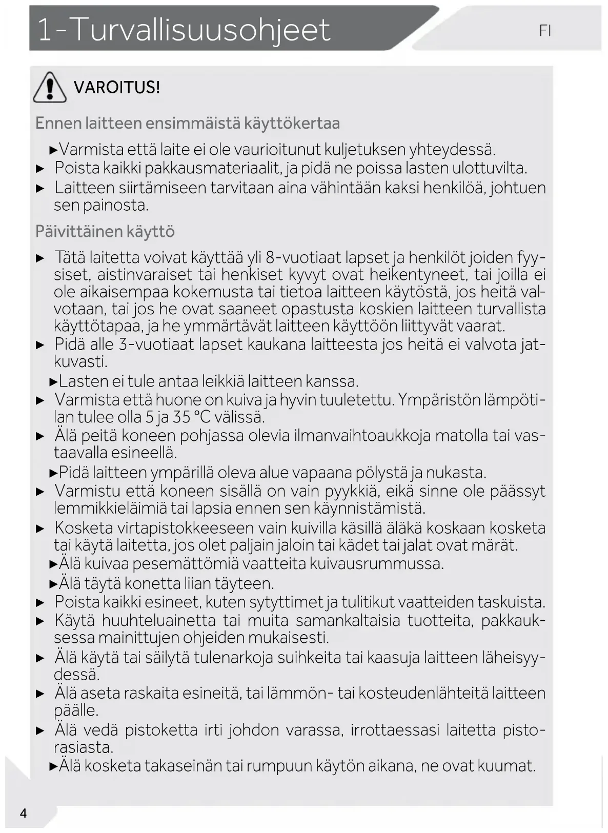 votaan, tai jos he ovat saaneet opastusta koskien laitteen turvallista käyttötapaa, ja he ymmärtävät laitteen käyttöön liittyvät vaarat. ▶ Pidä alle 3-vuotiaat lapset kaukana laitteesta jos heitä ei valvota jat