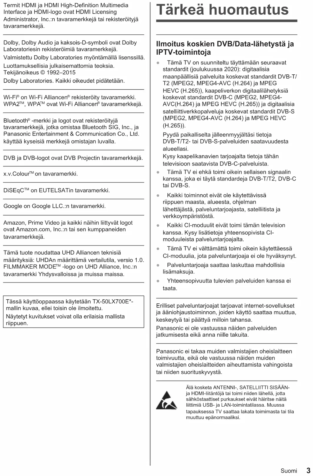 -logo on UHD Alliance, Inc.:n tavaramerkki Yhdysvalloissa ja muissa maissa. Tässä käyttöoppaassa käytetään TX-50LX700E*- mallin kuvaa, ellei toisin ole ilmoitettu. Näytetyt kuvitukset voivat olla erilaisia mallista riippuen. Tärkeä huomautus Ilmoitus koskien DVB/Data-lähetystä ja IPTV-toimintoja ● Tämä TV on suunniteltu täyttämään seuraavat standardit (joulukuussa 2020): digitaalisia maanpäällisiä palveluita koskevat standardit DVB-T/ T2 (MPEG2, MPEG4-AVC (H.264) ja MPEG HEVC (H.265)), kaapeliverkon digitaalilähetyksiä koskevat standardit DVB-C (MPEG2, MPEG4- AVC(H.264) ja MPEG HEVC (H.265)) ja digitaalisia satelliittiverkkopalveluja koskevat standardit DVB-S (MPEG2, MPEG4-AVC (H.264) ja MPEG HEVC (H.265)). Pyydä paikalliselta jälleenmyyjältäsi tietoja DVB-T/T2- tai DVB-S-palveluiden saatavuudesta alueellasi. Kysy kaapelikanavien tarjoajalta tietoja tähän televisioon saatavista DVB-C-palveluista. ● Tämä TV ei ehkä toimi oikein sellaisen signaalin kanssa, joka ei täytä standardeja DVB-T/T2, DVB-C tai DVB-S. ● Kaikki toiminnot eivät ole käytettävissä riippuen maasta, alueesta, ohjelman lähettäjästä, palveluntarjoajasta, satelliitista ja verkkoympäristöstä. ● Kaikki CI-moduulit eivät toimi tämän television kanssa. Kysy lisätietoja yhteensopivista CI- moduuleista palveluntarjoajalta. ● Tämä TV ei välttämättä toimi oikein käytettäessä CI-moduulia, jota palveluntarjoaja ei ole hyväksynyt. ● Palveluntarjoaja saattaa laskuttaa mahdollisia lisämaksuja. ● Yhteensopivuutta tulevien palveluiden kanssa ei taata. Erilliset palveluntarjoajat tarjoavat internet-sovellukset ja ääniohjaustoiminnon, joiden käyttö saattaa muuttua, keskeytyä tai päättyä milloin tahansa. Panasonic ei ole vastuussa näiden palveluiden jatkumisesta eikä anna niille takuita. Panasonic ei takaa muiden valmistajien oheislaitteen toimivuutta, eikä ole vastuussa näiden muiden valmistajien oheislaitteiden aiheuttamista vahingoista tai niiden suorituskyvystä. Älä kosketa ANTENNI-, SATELLIITTI SISÄÄN- ja HDMI-liitäntöjä tai toimi niiden lähellä, jotta sähköstaattiset purkaukset eivät häiritse näitä liittimiä USB- ja LAN-toimintatilassa. Muussa tapauksessa TV saattaa lakata toimimasta tai tila muuttuu epänormaaliksi.Suomi