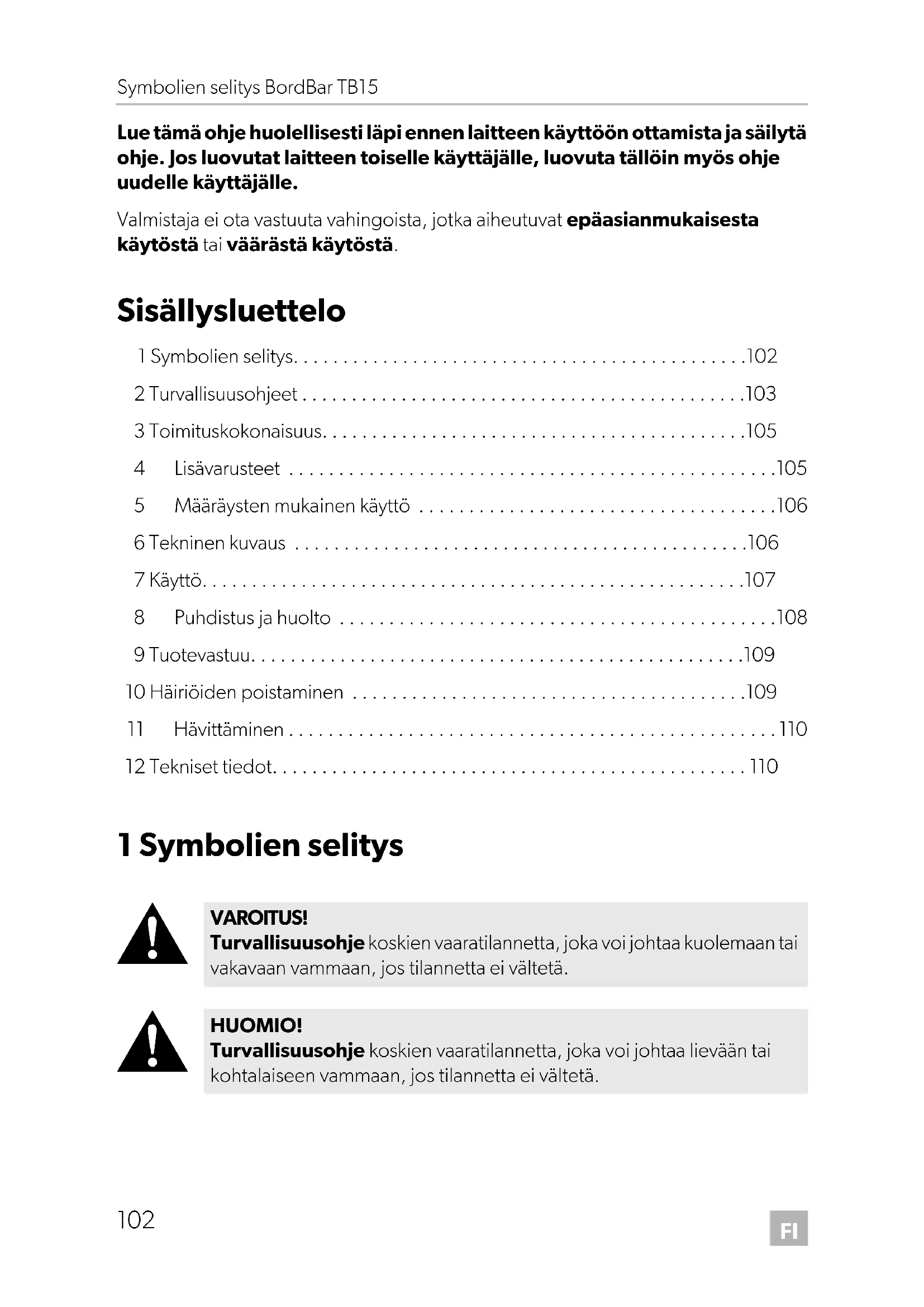 - Lue tämä ohje huolellisesti läpi ennen laitteen käyttöön ottamista ja säilytä ohje. Jos luovutat laitteen toiselle käyttäjälle, luovuta tällöin myös ohje uudelle käyttäjälle. Valmistaja ei ota vastuuta vahingoista, jotka aiheutuvat epäasianmukaisesta käytöstä tai väärästä käytöstä. Sisällysluettelo 1 Symbolien selitys p. 102