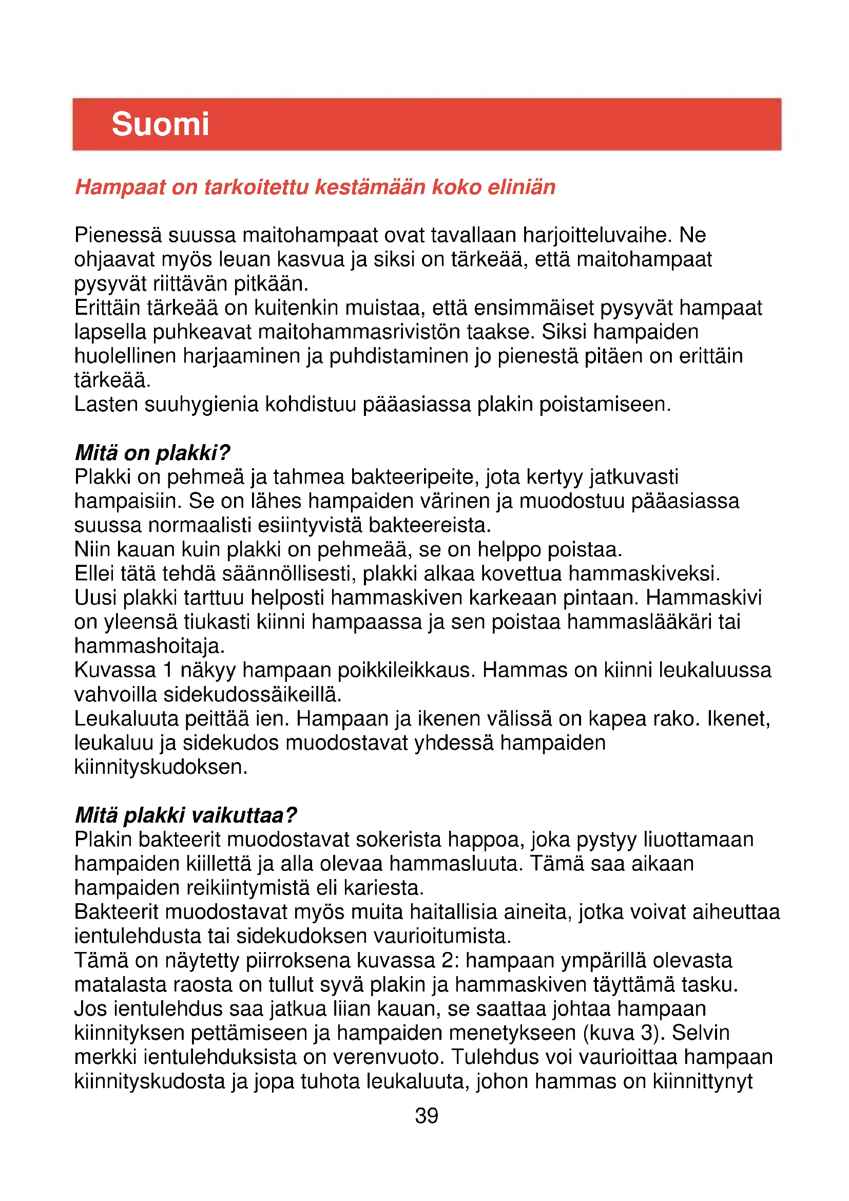 - OBS: Apparaten kan även lämnas till en av Philips auktoriserad verkstad där personalen gärna hjälper till att ta hand om apparaten. 38Suomi Hampaat on tarkoitettu kestämään koko eliniän Pienessä suussa maitohampaat ovat tavallaan harjoitteluvaihe. Ne ohjaavat myös leuan kasvua ja siksi on tärkeää, että maitohampaat pysyvät riittävän pitkään. Erittäin tärkeää on kuitenkin muistaa, että ensimmäiset pysyvät hampaat lapsella puhkeavat maitohammasrivistön taakse. Siksi hampaiden huolellinen harjaaminen ja puhdistaminen jo pienestä pitäen on erittäin tärkeää. Lasten suuhygienia kohdistuu pääasiassa plakin poistamiseen. Mitä on plakki? Plakki on pehmeä ja tahmea bakteeripeite, jota kertyy jatkuvasti hampaisiin. Se on lähes hampaiden värinen ja muodostuu pääasiassa suussa normaalisti esiintyvistä bakteereista. Niin kauan kuin plakki on pehmeää, se on helppo poistaa. Ellei tätä tehdä säännöllisesti, plakki alkaa kovettua hammaskiveksi. Uusi plakki tarttuu helposti hammaskiven karkeaan pintaan. Hammaskivi on yleensä tiukasti kiinni hampaassa ja sen poistaa hammaslääkäri tai hammashoitaja. Kuvassa 1 näkyy hampaan poikkileikkaus. Hammas on kiinni leukaluussa vahvoilla sidekudossäikeillä. Leukaluuta peittää ien. Hampaan ja ikenen välissä on kapea rako. Ikenet, leukaluu ja sidekudos muodostavat yhdessä hampaiden kiinnityskudoksen. Mitä plakki vaikuttaa? Plakin bakteerit muodostavat sokerista happoa, joka pystyy liuottamaan hampaiden kiillettä ja alla olevaa hammasluuta. Tämä saa aikaan hampaiden reikiintymistä eli kariesta. Bakteerit muodostavat myös muita haitallisia aineita, jotka voivat aiheuttaa ientulehdusta tai sidekudoksen vaurioitumista. Tämä on näytetty piirroksena kuvassa 2: hampaan ympärillä olevasta matalasta raosta on tullut syvä plakin ja hammaskiven täyttämä tasku. Jos ientulehdus saa jatkua liian kauan, se saattaa johtaa hampaan kiinnityksen pettämiseen ja hampaiden menetykseen (kuva 3). Selvin merkki ientulehduksista on verenvuoto. Tulehdus voi vaurioittaa hampaan kiinnityskudosta ja jopa tuhota leukaluuta, johon hammas on kiinnittynyt 39hyvin ohuilla sidekudossäikeillä. Plakin perusteellinen ja säännöllinen poistaminen estää ientulehduksen alkamisen ja auttaa pysäyttämään sidekudoksen vaurioitumisen. Philipsin ladattava hammasharja HP 375 Clean & Clear -harjausliike (kuva 4a) Harja liikkuu kahteen suuntaan ja kahdella nopeudella samanaikaisesti: