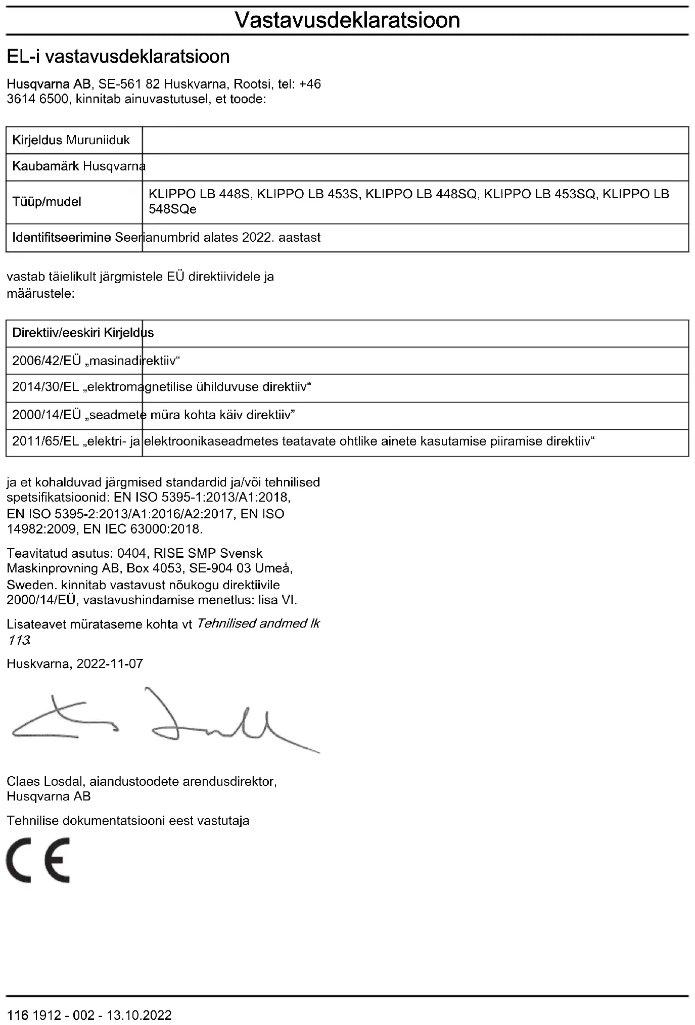 5028813-10 Ajo Nopeus, km/h 4,5 4,5 4,5 4,5 4,5 128 1912 - 002 - 13.10.2022Vaatimustenmukaisuusvakuutus EU-vaatimustenmukaisuusvakuutus Husqvarna AB, SE-561 82 Huskvarna, Ruotsi, puh. +46 36 146500, vakuuttaa täten, että tuote: Kuvaus Ruohonleikkuri Tuotemerkki Husqvarna Tyyppi/malli KLIPPO LB 448S, KLIPPO LB 453S, KLIPPO LB 448SQ, KLIPPO LB 453SQ, KLIPPO LB 548SQe Tunniste Sarjanumerot vuodesta 2022 alkaen vastaavat täysin seuraavien EU:n direktiivien ja asetusten vaatimuksia: Direktiivi/asetus Kuvaus 2006/42/EC konedirektiivi 2014/30/EU EMC-direktiivi 2000/14/EC Melupäästödirektiivi 2011/65/EU Direktiivi tiettyjen vaarallisten aineiden käytön rajoittamisesta sähkö- ja elektroniikkalaitteissa ja että asiassa sovelletaan seuraavia standardeja ja/tai teknisiä tietoja: EN ISO 5395-1:2013/A1:2018, EN ISO