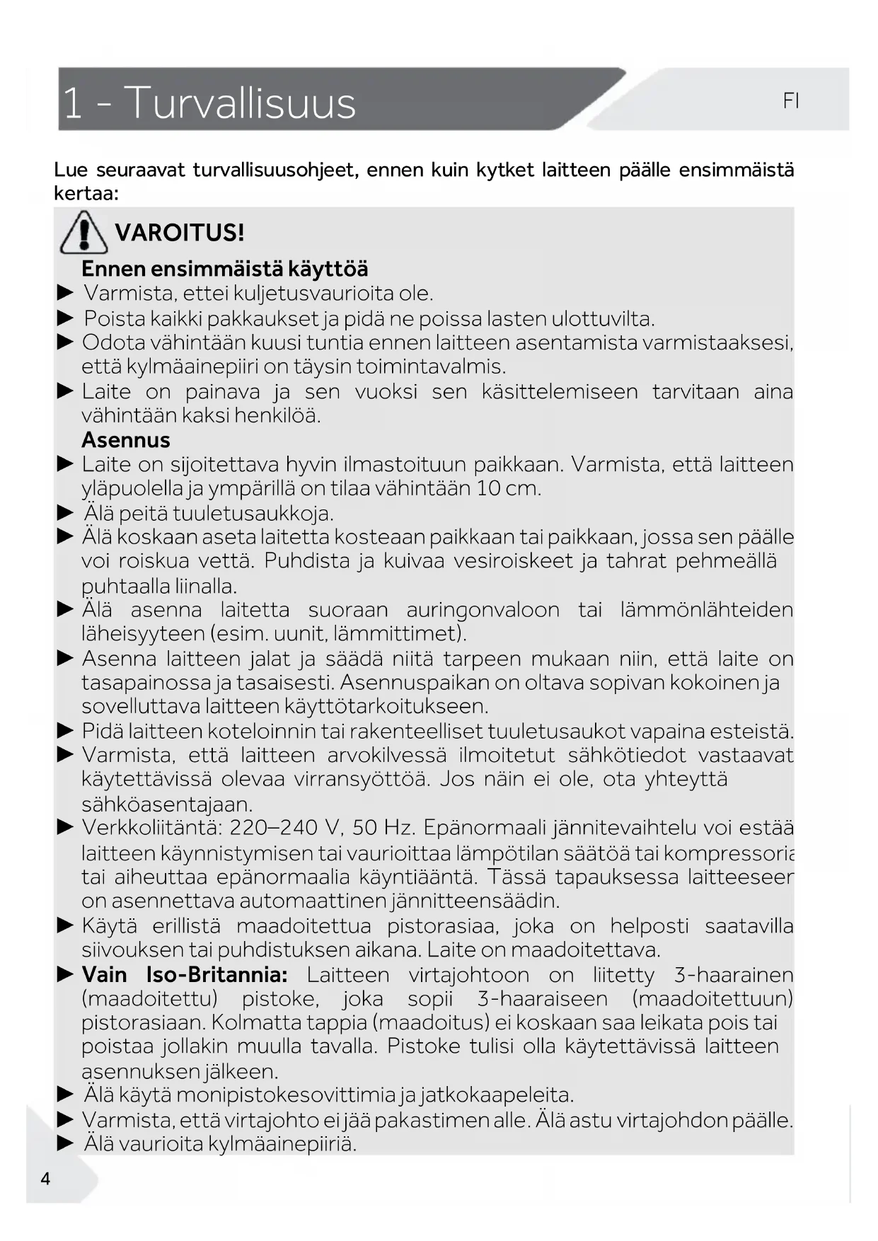 VAROITUS! Ennen ensimmäistä käyttöä ► Varmista, ettei kuljetusvaurioita ole. ► Poista kaikki pakkaukset ja pidä ne poissa lasten ulottuvilta. ► Odota vähintään kuusi tuntia ennen laitteen asentamista varmistaaksesi, että kylmäainepiiri on täysin toimintavalmis. ► Laite on painava ja sen vuoksi sen käsittelemiseen tarvitaan aina vähintään kaksi henkilöä. Asennus ► Laite on sijoitettava hyvin ilmastoituun paikkaan. Varmista, että laitteen yläpuolella ja ympärillä on tilaa vähintään 10 cm. ► Älä peitä tuuletusaukkoja. ► Älä koskaan aseta laitetta kosteaan paikkaan tai paikkaan, jossa sen päälle voi roiskua vettä. Puhdista ja kuivaa vesiroiskeet ja tahrat pehmeällä puhtaalla liinalla. ► Älä asenna laitetta suoraan auringonvaloon tai lämmönlähteiden läheisyyteen (esim. uunit, lämmittimet). ► Asenna laitteen jalat ja säädä niitä tarpeen mukaan niin, että laite on tasapainossa ja tasaisesti. Asennuspaikan on oltava sopivan kokoinen ja sovelluttava laitteen käyttötarkoitukseen. ► Pidä laitteen koteloinnin tai rakenteelliset tuuletusaukot vapaina esteistä. ► Varmista, että laitteen arvokilvessä ilmoitetut sähkötiedot vastaavat käytettävissä olevaa virransyöttöä. Jos näin ei ole, ota yhteyttä sähköasentajaan. ► Verkkoliitäntä: 220–240 V, 50 Hz. Epänormaali jännitevaihtelu voi estää laitteen käynnistymisen tai vaurioittaa lämpötilan säätöä tai kompressoria tai aiheuttaa epänormaalia käyntiääntä. Tässä tapauksessa laitteeseen on asennettava automaattinen jännitteensäädin. ► Käytä erillistä maadoitettua pistorasiaa, joka on helposti saatavilla siivouksen tai puhdistuksen aikana. Laite on maadoitettava. ► Vain Iso-Britannia: Laitteen virtajohtoon on liitetty 3-haarainen (maadoitettu) pistoke, joka sopii 3-haaraiseen (maadoitettuun) pistorasiaan. Kolmatta tappia (maadoitus) ei koskaan saa leikata pois tai poistaa jollakin muulla tavalla. Pistoke tulisi olla käytettävissä laitteen asennuksen jälkeen. ► Älä käytä monipistokesovittimia ja jatkokaapeleita. ► Varmista, että virtajohto ei jää pakastimen alle. Älä astu virtajohdon päälle. ► Älä vaurioita kylmäainepiiriä.FI