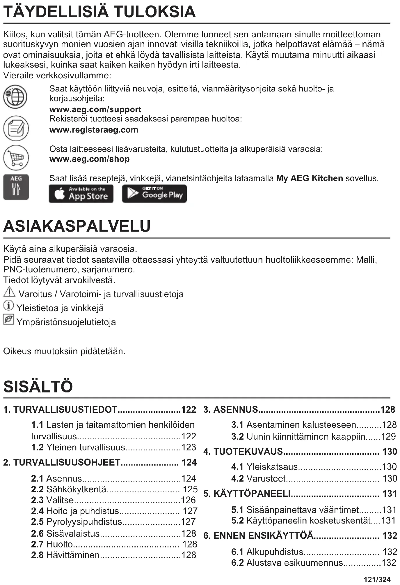 Kiitos, kun valitsit tämän AEG-tuotteen. Olemme luoneet sen antamaan sinulle moitteettoman suorituskyvyn monien vuosien ajan innovatiivisilla tekniikoilla, jotka helpottavat elämää – nämä ovat ominaisuuksia, joita et ehkä löydä tavallisista laitteista. Käytä muutama minuutti aikaasi lukeaksesi, kuinka saat kaiken kaiken hyödyn irti laitteesta. Vieraile verkkosivullamme: Saat käyttöön liittyviä neuvoja, esitteitä, vianmääritysohjeita sekä huolto- ja korjausohjeita: www.aeg.com/support Rekisteröi tuotteesi saadaksesi parempaa huoltoa: www.registeraeg.com Osta laitteeseesi lisävarusteita, kulutustuotteita ja alkuperäisiä varaosia: www.aeg.com/shop Saat lisää reseptejä, vinkkejä, vianetsintäohjeita lataamalla My AEG Kitchen sovellus. ASIAKASPALVELU Käytä aina alkuperäisiä varaosia. Pidä seuraavat tiedot saatavilla ottaessasi yhteyttä valtuutettuun huoltoliikkeeseemme: Malli, PNC-tuotenumero, sarjanumero. Tiedot löytyvät arvokilvestä. Varoitus / Varotoimi- ja turvallisuustietoja Yleistietoa ja vinkkejä Ympäristönsuojelutietoja Oikeus muutoksiin pidätetään. SISÄLTÖ