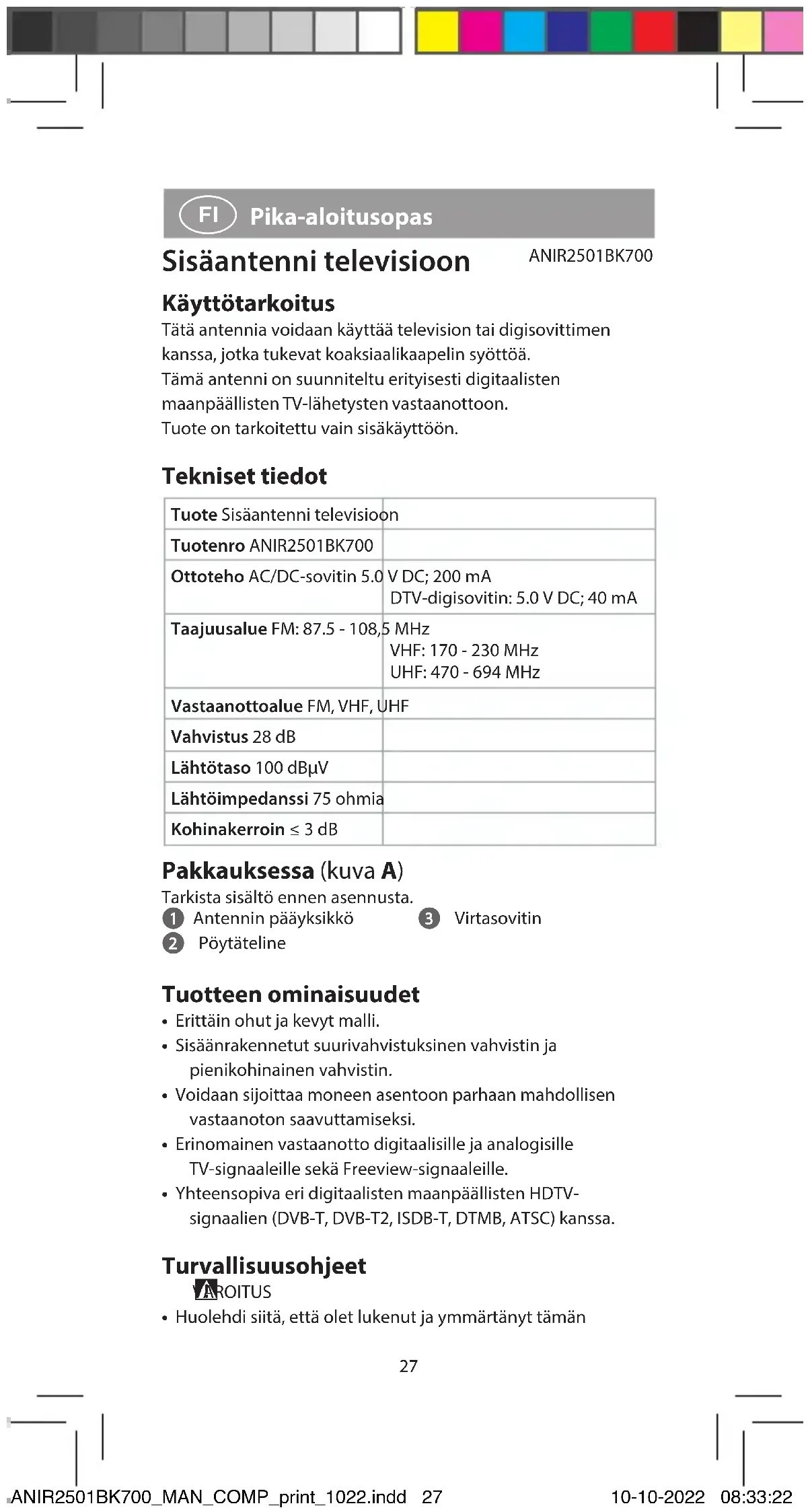 Pika-aloitusopas Sisäantenni televisioon ANIR2501BK700 Käyttötarkoitus Tätä antennia voidaan käyttää television tai digisovittimen kanssa, jotka tukevat koaksiaalikaapelin syöttöä.Tämä antenni on suunniteltu erityisesti digitaalisten maanpäällisten TV-lähetysten vastaanottoon.Tuote on tarkoitettu vain sisäkäyttöön. Tekniset tiedot Tuote Sisäantenni televisioonTuotenro ANIR2501BK700Ottoteho AC/DC-sovitin 5.0 V DC; 200 mADTV-digisovitin: 5.0 V DC; 40 mATaajuusalue FM: 87.5 - 108,5 MHzVHF: 170 - 230 MHzUHF: 470 - 694 MHzVastaanottoalue FM, VHF, UHFVahvistus 28 dBLähtötaso 100 dBµVLähtöimpedanssi 75 ohmiaKohinakerroin ≤ 3 dB Pakkauksessa (kuva A) Tarkista sisältö ennen asennusta. 1 Antennin pääyksikkö 2 Pöytäteline 3 Virtasovitin Tuotteen ominaisuudet