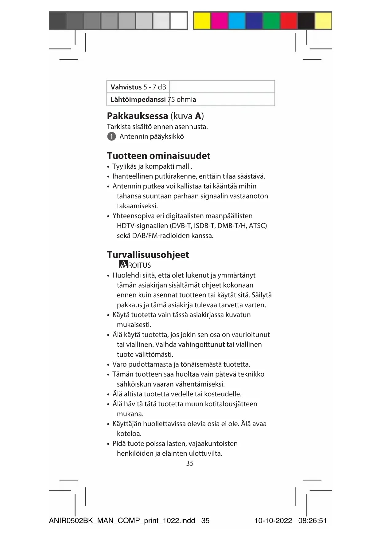- Pidä tuote poissa lasten, vajaakuntoisten henkilöiden ja eläinten ulottuvilta. ANIR0502BK_MAN_COMP_print_1022.indd 35ANIR0502BK_MAN_COMP_print_1022.indd 35 10-10-2022 08:26:5110-10-2022 08:26:5136