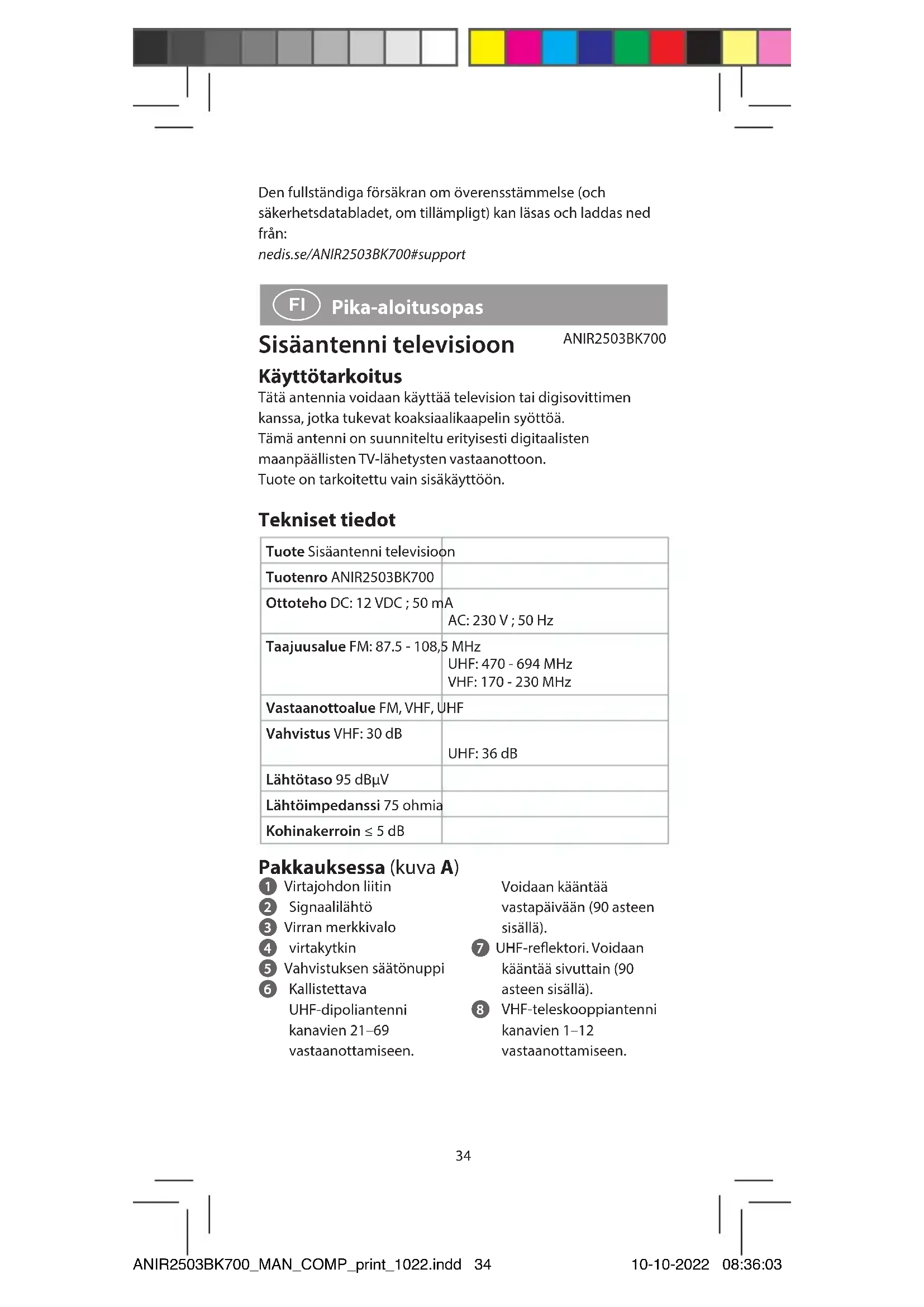 Pika-aloitusopas Sisäantenni televisioon ANIR2503BK700 Käyttötarkoitus Tätä antennia voidaan käyttää television tai digisovittimen kanssa, jotka tukevat koaksiaalikaapelin syöttöä. Tämä antenni on suunniteltu erityisesti digitaalisten maanpäällisten TV-lähetysten vastaanottoon. Tuote on tarkoitettu vain sisäkäyttöön. Tekniset tiedot Tuote Sisäantenni televisioon Tuotenro ANIR2503BK700 Ottoteho DC: 12 VDC ; 50 mA AC: 230 V ; 50 Hz Taajuusalue FM: 87.5 - 108,5 MHz UHF: 470 - 694 MHz VHF: 170 - 230 MHz Vastaanottoalue FM, VHF, UHF Vahvistus VHF: 30 dB UHF: 36 dB Lähtötaso 95 dBµV Lähtöimpedanssi 75 ohmia Kohinakerroin ≤ 5 dB Pakkauksessa (kuva A) 1 Virtajohdon liitin 2 Signaalilähtö 3 Virran merkkivalo 4 virtakytkin 5 Vahvistuksen säätönuppi 6 Kallistettava UHF-dipoliantenni kanavien 21–69 vastaanottamiseen. Voidaan kääntää vastapäivään (90 asteen sisällä). 7 UHF-reektori. Voidaan kääntää sivuttain (90 asteen sisällä). 8 VHF-teleskooppiantenni kanavien 1–12 vastaanottamiseen. ANIR2503BK700_MAN_COMP_print_1022.indd 34ANIR2503BK700_MAN_COMP_print_1022.indd 34 10-10-2022 08:36:0310-10-2022 08:36:0335 Turvallisuusohjeet