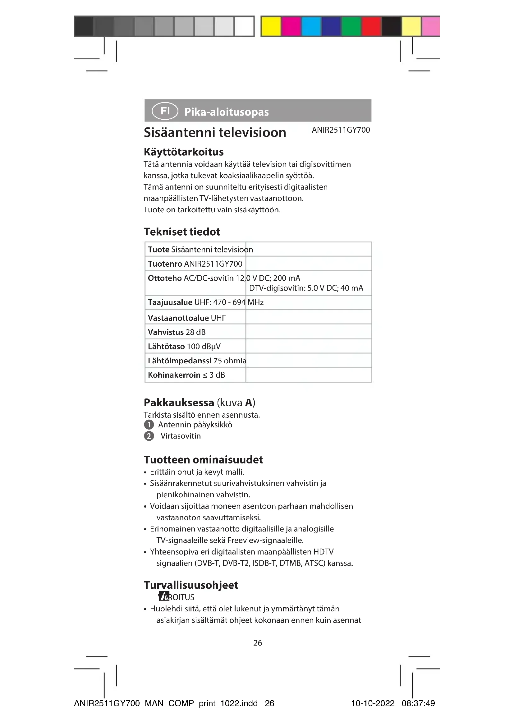 Pika-aloitusopas Sisäantenni televisioon ANIR2511GY700 Käyttötarkoitus Tätä antennia voidaan käyttää television tai digisovittimen kanssa, jotka tukevat koaksiaalikaapelin syöttöä.Tämä antenni on suunniteltu erityisesti digitaalisten maanpäällisten TV-lähetysten vastaanottoon.Tuote on tarkoitettu vain sisäkäyttöön. Tekniset tiedot Tuote Sisäantenni televisioonTuotenro ANIR2511GY700Ottoteho AC/DC-sovitin 12,0 V DC; 200 mADTV-digisovitin: 5.0 V DC; 40 mATaajuusalue UHF: 470 - 694 MHzVastaanottoalue UHFVahvistus 28 dBLähtötaso 100 dBµVLähtöimpedanssi 75 ohmiaKohinakerroin ≤ 3 dB Pakkauksessa (kuva A) Tarkista sisältö ennen asennusta. 1 Antennin pääyksikkö 2 Virtasovitin Tuotteen ominaisuudet