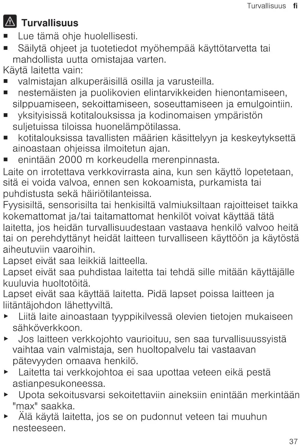 Turvallisuus ¡ Lue tämä ohje huolellisesti. ¡ Säilytä ohjeet ja tuotetiedot myöhempää käyttötarvetta tai mahdollista uutta omistajaa varten. Käytä laitetta vain: ¡ valmistajan alkuperäisillä osilla ja varusteilla. ¡ nestemäisten ja puolikovien elintarvikkeiden hienontamiseen, silppuamiseen, sekoittamiseen, soseuttamiseen ja emulgointiin. ¡ yksityisissä kotitalouksissa ja kodinomaisen ympäristön suljetuissa tiloissa huonelämpötilassa. ¡ kotitalouksissa tavallisten määrien käsittelyyn ja keskeytyksettä ainoastaan ohjeissa ilmoitetun ajan. ¡ enintään 2000m korkeudella merenpinnasta. Laite on irrotettava verkkovirrasta aina, kun sen käyttö lopetetaan, sitä ei voida valvoa, ennen sen kokoamista, purkamista tai puhdistusta sekä häiriötilanteissa. Fyysisiltä, sensorisilta tai henkisiltä valmiuksiltaan rajoitteiset taikka kokemattomat ja/tai taitamattomat henkilöt voivat käyttää tätä laitetta, jos heidän turvallisuudestaan vastaava henkilö valvoo heitä tai on perehdyttänyt heidät laitteen turvalliseen käyttöön ja käytöstä aiheutuviin vaaroihin. Lapset eivät saa leikkiä laitteella. Lapset eivät saa puhdistaa laitetta tai tehdä sille mitään käyttäjälle kuuluvia huoltotöitä. Lapset eivät saa käyttää laitetta. Pidä lapset poissa laitteen ja liitäntäjohdon lähettyviltä. ▶ Liitä laite ainoastaan tyyppikilvessä olevien tietojen mukaiseen sähköverkkoon. ▶ Jos laitteen verkkojohto vaurioituu, sen saa turvallisuussyistä vaihtaa vain valmistaja, sen huoltopalvelu tai vastaavan pätevyyden omaava henkilö. ▶ Laitetta tai verkkojohtoa ei saa upottaa veteen eikä pestä astianpesukoneessa. ▶ Upota sekoitusvarsi sekoitettaviin aineksiin enintään merkintään "max" saakka. ▶ Älä käytä laitetta, jos se on pudonnut veteen tai muuhun nesteeseen.fi Esinevahinkojen välttäminen