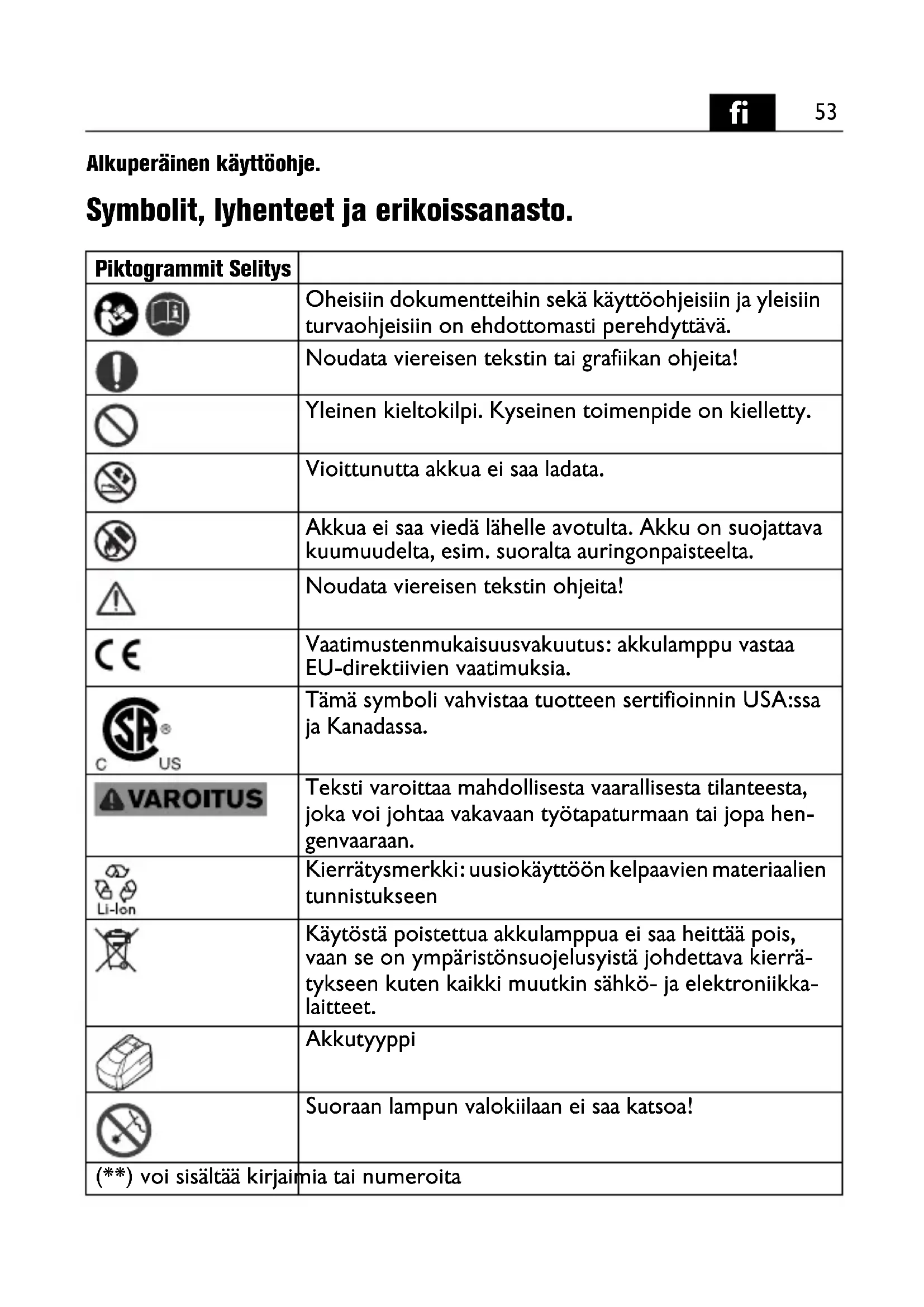 Alkuperäinen käyttöohje. Symbolit, lyhenteet ja erikoissanasto. Piktogrammit Selitys Oheisiin dokumentteihin sekä käyttöohjeisiin ja yleisiin turvaohjeisiin on ehdottomasti perehdyttävä. Noudata viereisen tekstin tai grafiikan ohjeita! Yleinen kieltokilpi. Kyseinen toimenpide on kielletty. Vioittunutta akkua ei saa ladata. Akkua ei saa viedä lähelle avotulta. Akku on suojattava kuumuudelta, esim. suoralta auringonpaisteelta. Noudata viereisen tekstin ohjeita! Vaatimustenmukaisuusvakuutus: akkulamppu vastaa EU-direktiivien vaatimuksia. Tämä symboli vahvistaa tuotteen sertifioinnin USA:ssa ja Kanadassa. Teksti varoittaa mahdollisesta vaarallisesta tilanteesta, joka voi johtaa vakavaan työtapaturmaan tai jopa hen- genvaaraan. Kierrätysmerkki: uusiokäyttöön kelpaavien materiaalien tunnistukseen Käytöstä poistettua akkulamppua ei saa heittää pois, vaan se on ympäristönsuojelusyistä johdettava kierrä- tykseen kuten kaikki muutkin sähkö- ja elektroniikka- laitteet. Akkutyyppi Suoraan lampun valokiilaan ei saa katsoa! (**) voi sisältää kirjaimia tai numeroita OBJ_BUCH-0000000215-001.book Page 53 Friday, August 7, 2015 9:31 AM54
