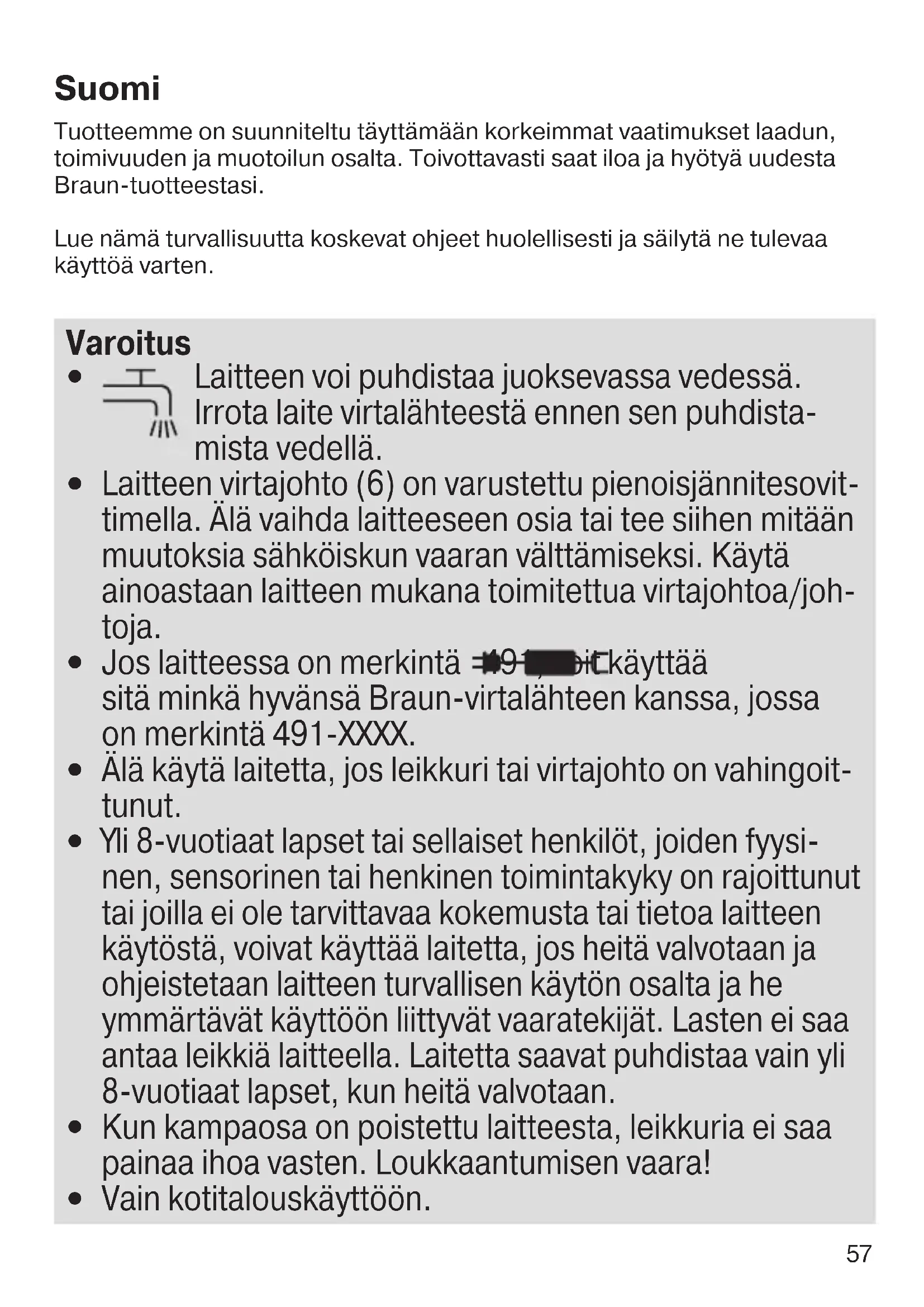 Jos laitteessa on merkintä 491, voit käyttää sitä minkä hyvänsä Braun-virtalähteen kanssa, jossa on merkintä 491-XXXX.