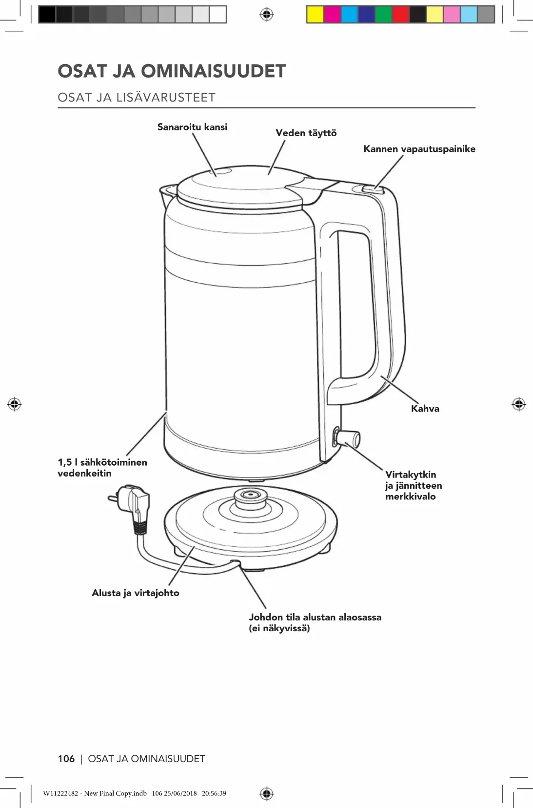 Veden täyttö Kannen vapautuspainike Sanaroitu kansi Alusta ja virtajohto Virtakytkin ja jännitteen merkkivalo Kahva 1,5 l sähkötoiminen vedenkeitin Johdon tila alustan alaosassa (ei näkyvissä) W11222482 - New Final Copy.indb 106 25/06/2018 20:56:39SÄHKÖTOIMISEN VEDENKEITTIMEN TURVALLISUUS | 107 SUOMI