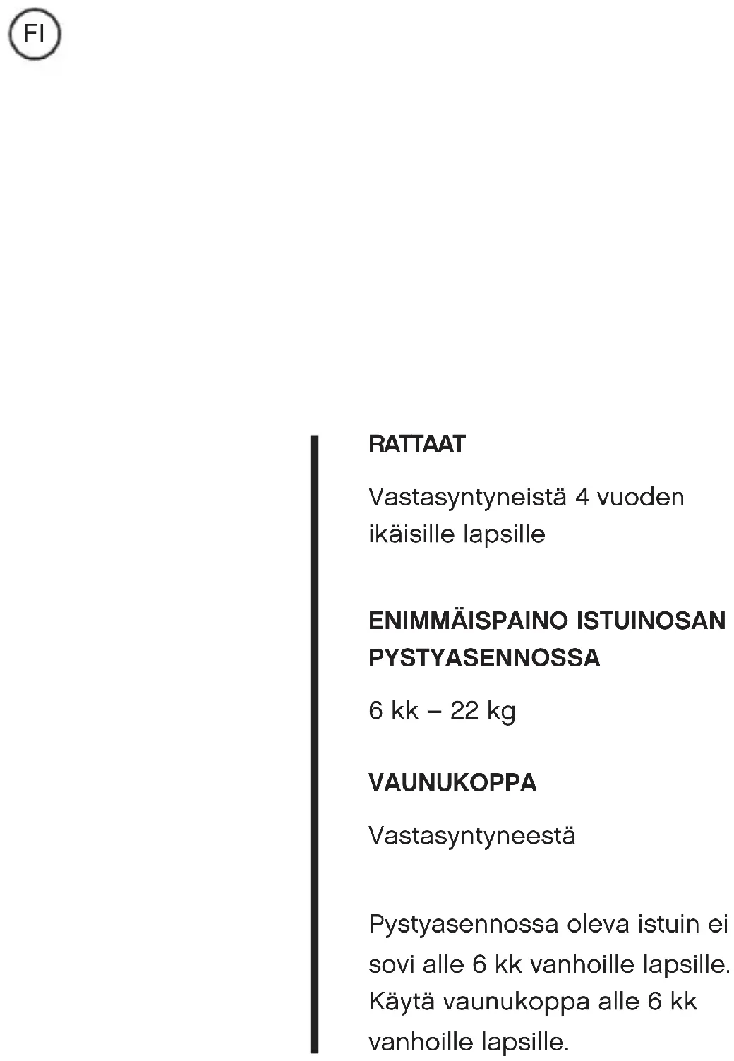 PYSTYASENNOSSA 6 kk – 22 kg VAUNUKOPPA Vastasyntyneestä Pystyasennossa oleva istuin ei sovi alle 6 kk vanhoille lapsille. Käytä vaunukoppa alle 6 kk vanhoille lapsille.75