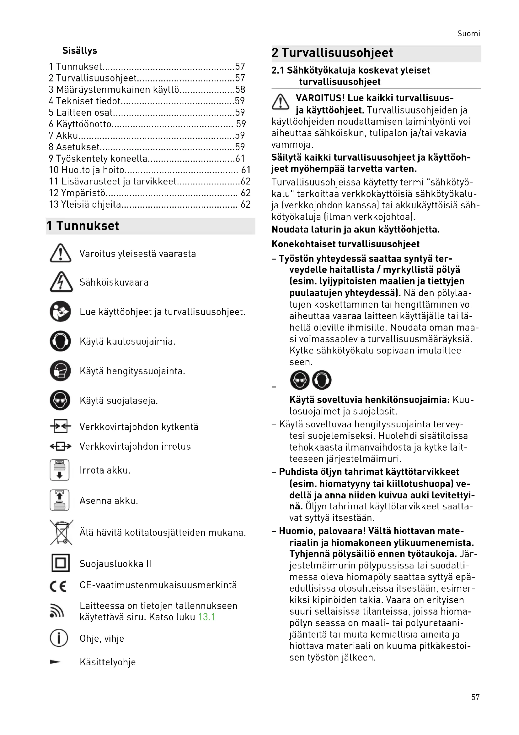 - 13 Yleisiä ohjeita 1 Tunnukset Varoitus yleisestä vaarasta Sähköiskuvaara Lue käyttöohjeet ja turvallisuusohjeet. Käytä kuulosuojaimia. Käytä hengityssuojainta. Käytä suojalaseja. Verkkovirtajohdon kytkentä Verkkovirtajohdon irrotus Irrota akku. Asenna akku. Älä hävitä kotitalousjätteiden mukana. Suojausluokka II CE-vaatimustenmukaisuusmerkintä Laitteessa on tietojen tallennukseen käytettävä siru. Katso luku13.1 Ohje, vihje Käsittelyohje 2 Turvallisuusohjeet p. 62