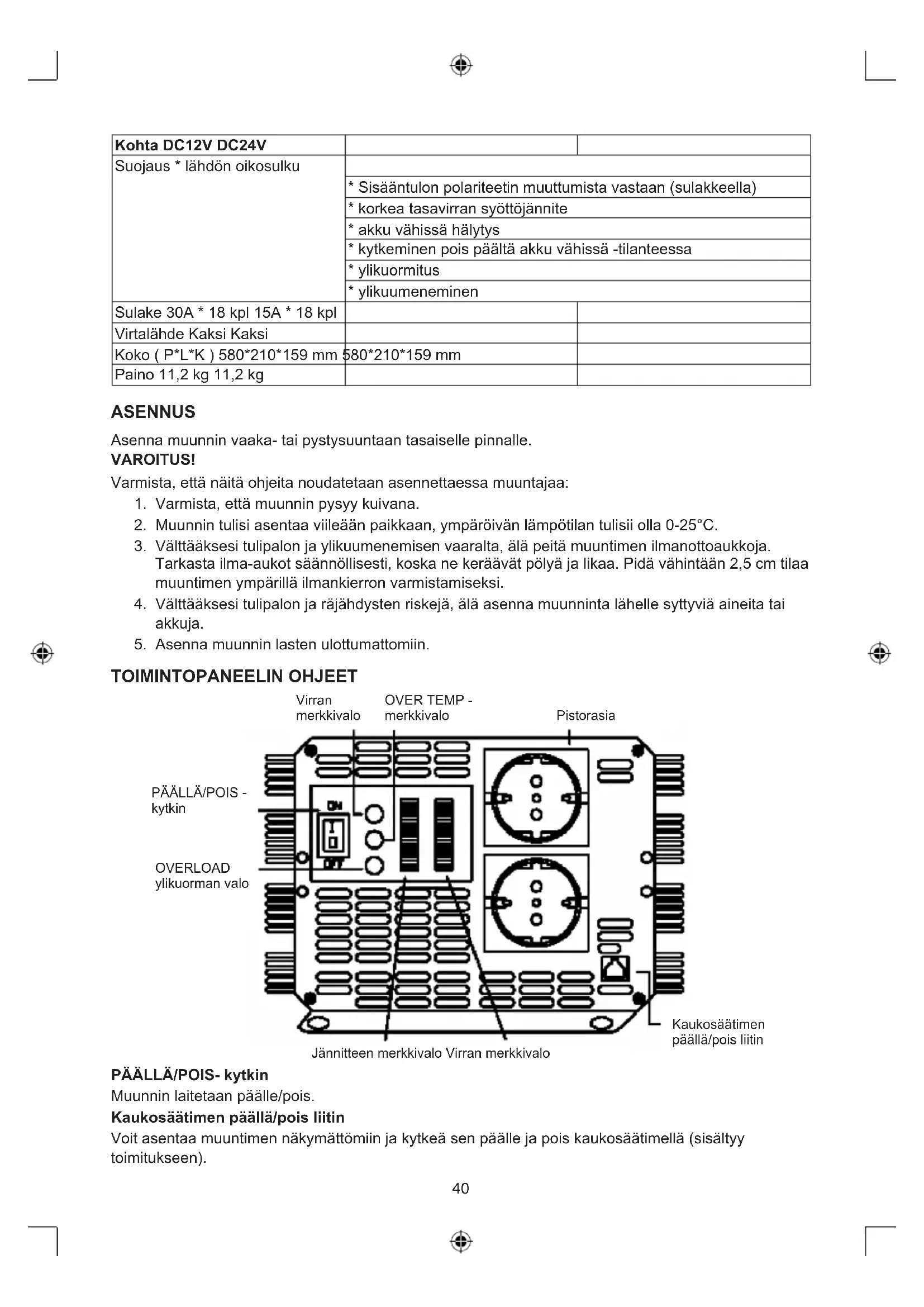 - ylikuumeneminen Sulake 30A * 18 kpl 15A * 18 kpl Virtalähde Kaksi Kaksi Koko ( P*L*K ) 580*210*159 mm 580*210*159 mm Paino 11,2 kg 11,2 kg ASENNUS Asenna muunnin vaaka- tai pystysuuntaan tasaiselle pinnalle. VAROITUS! Varmista, että näitä ohjeita noudatetaan asennettaessa muuntajaa:
