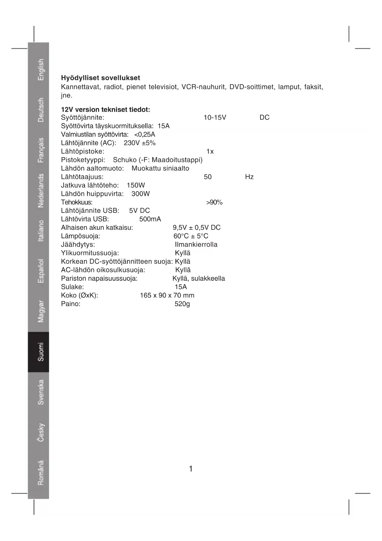 - Varmista, ettei liitettyjen laitteiden jatkuva kokonaiskuormitus ylitä 150 wattia