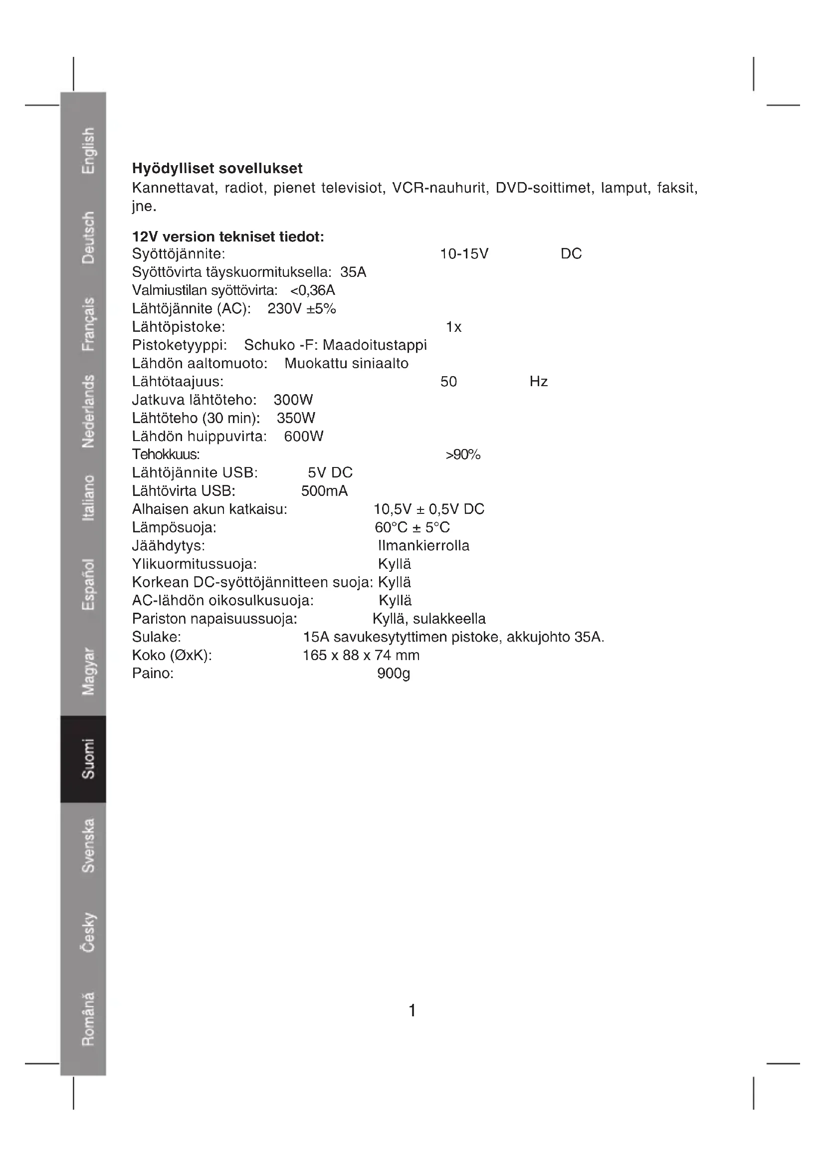 Kun laitetta käytetään pitempiä aikajaksoja, ajoneuvon moottori kannattaa pitää käynnissä, jotta akku ei purkautuisi täysin. Kun alhaisen akun hälytys aktivoituu, käynnistä auton moottori jatkaaksesi muuntimen ja siihen liitettyjen varusteiden käyttöä. Varmista, että liitettyjen laitteiden vaatima maksmiteho ei ylitä muuntimen lähtötehoa (300 W jatkuvasti, 350 W enintään 30 minuutin ajan).