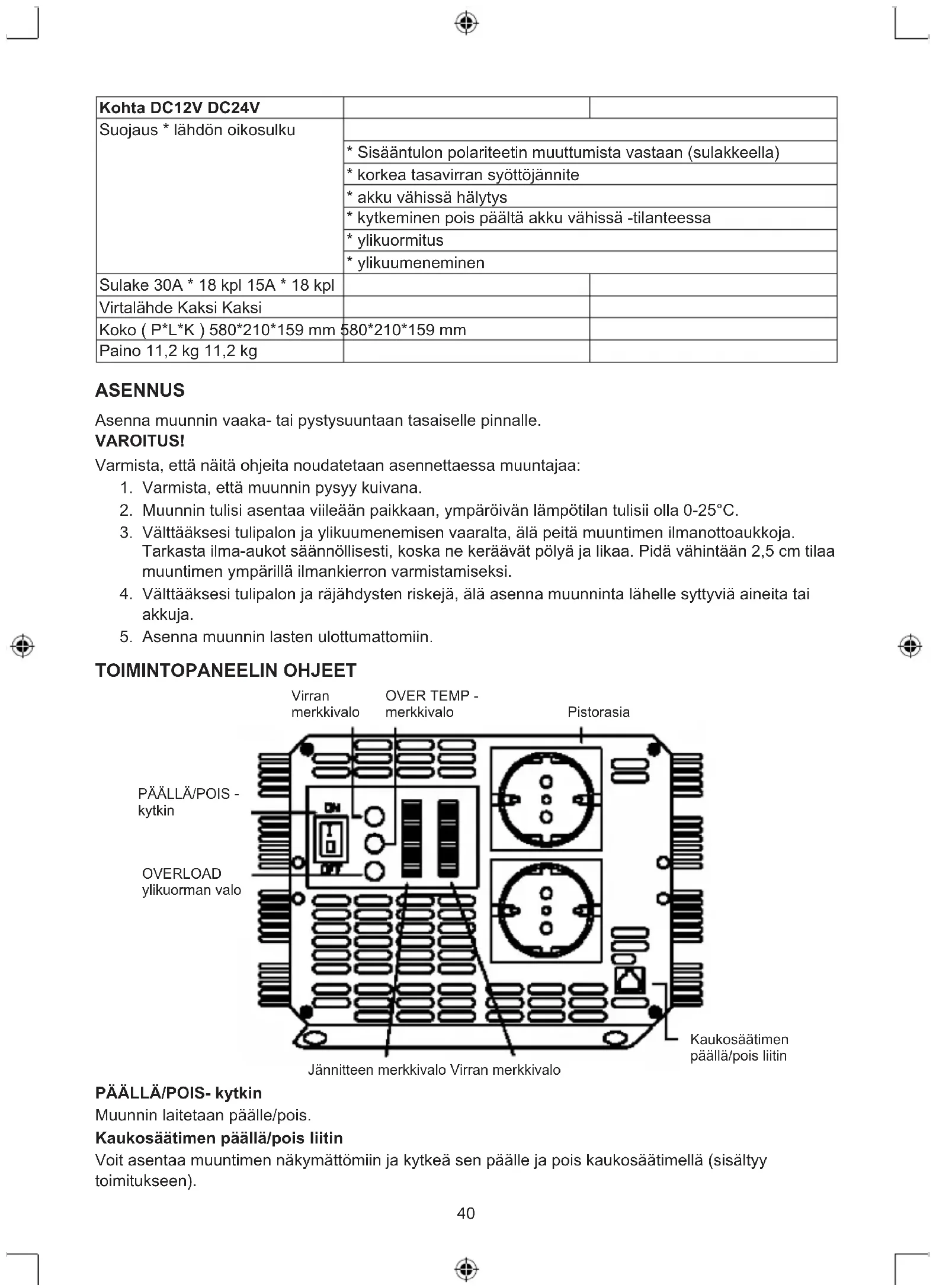 - ylikuumeneminen Sulake 30A * 18 kpl 15A * 18 kpl Virtalähde Kaksi Kaksi Koko ( P*L*K ) 580*210*159 mm 580*210*159 mm Paino 11,2 kg 11,2 kg ASENNUS Asenna muunnin vaaka- tai pystysuuntaan tasaiselle pinnalle. VAROITUS! Varmista, että näitä ohjeita noudatetaan asennettaessa muuntajaa: