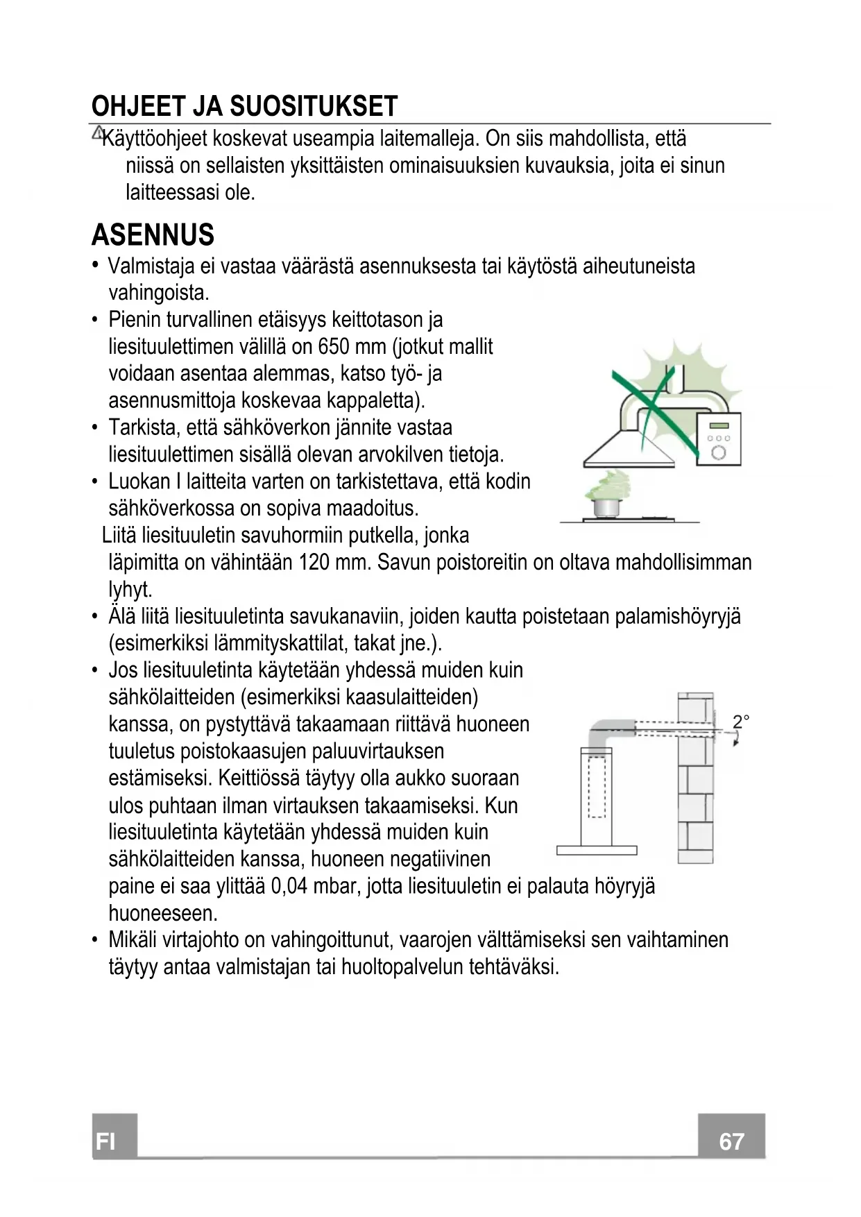 - Jos liesituuletinta käytetään yhdessä muiden kuin sähkölaitteiden (esimerkiksi kaasulaitteiden) kanssa, on pystyttävä takaamaan riittävä huoneen tuuletus poistokaasujen paluuvirtauksen estämiseksi. Keittiössä täytyy olla aukko suoraan ulos puhtaan ilman virtauksen takaamiseksi. Kun liesituuletinta käytetään yhdessä muiden kuin sähkölaitteiden kanssa, huoneen negatiivinen paine ei saa ylittää 0,04 mbar, jotta liesituuletin ei palauta höyryjä huoneeseen.
