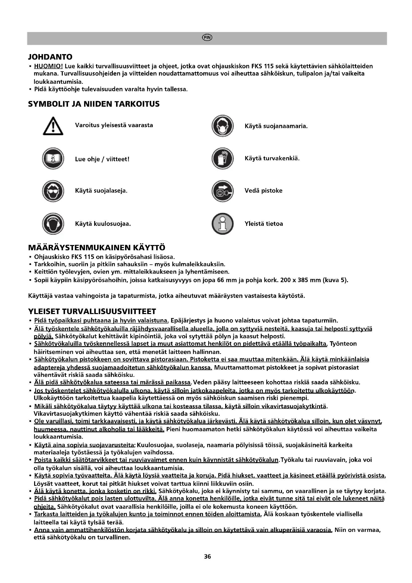 - Anna vain ammattihenkilöstön korjata sähkötyökalu ja silloin on käytettävä vain alkuperäisiä varaosia. Niin on varmaa, että sähkötyökalu on turvallinen. JOHDANTO