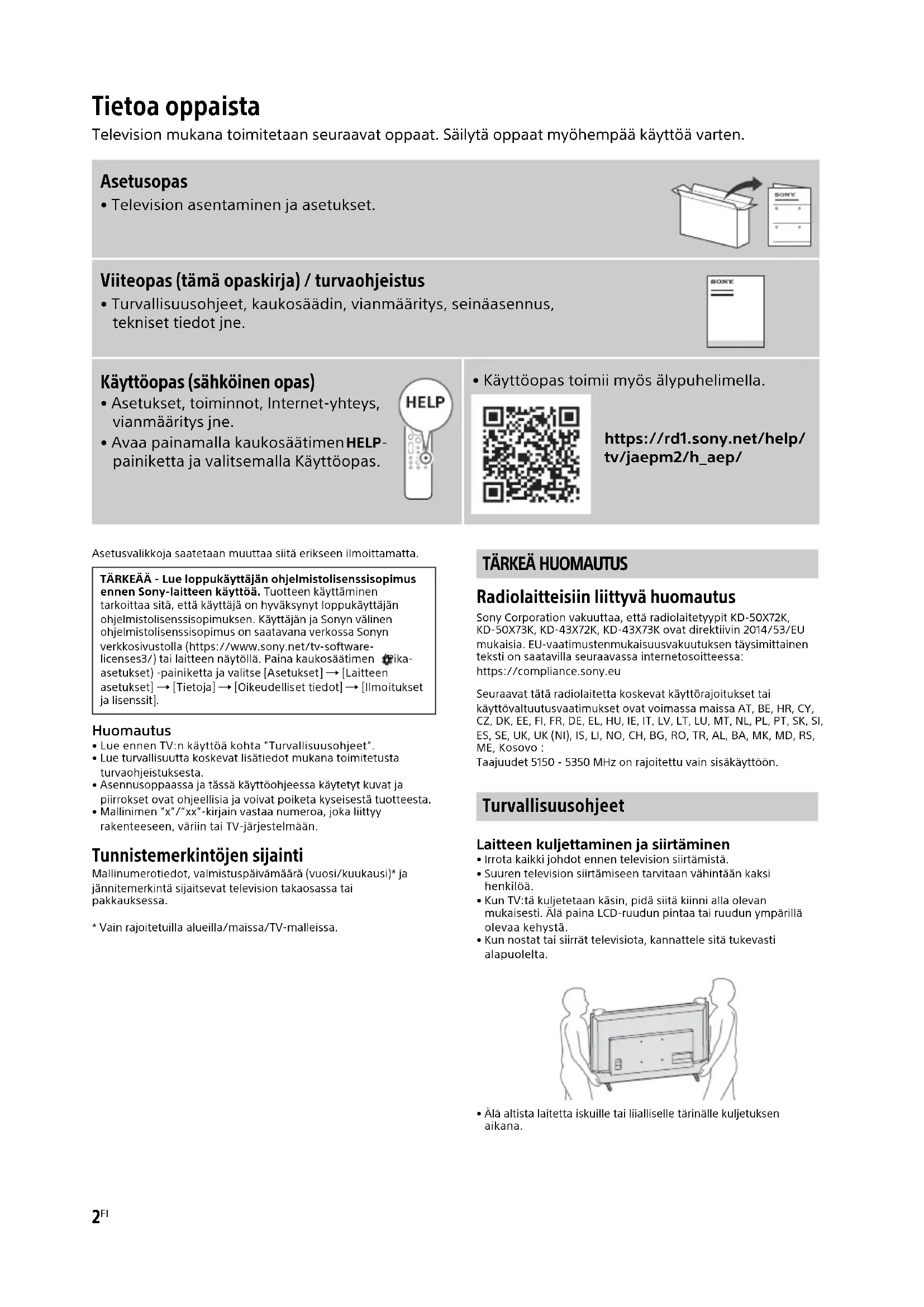 - Vain rajoitetuilla alueilla/maissa/TV-malleissa. Radiolaitteisiin liittyvä huomautus Sony Corporation vakuuttaa, että radiolaitetyypit KD-50X72K, KD-50X73K, KD-43X72K, KD-43X73K ovat direktiivin 2014/53/EU mukaisia. EU-vaatimustenmukaisuusvakuutuksen täysimittainen teksti on saatavilla seuraavassa internetosoitteessa: https://compliance.sony.eu Seuraavat tätä radiolaitetta koskevat käyttörajoitukset tai käyttövaltuutusvaatimukset ovat voimassa maissa AT, BE, HR, CY, CZ, DK, EE, FI, FR, DE, EL, HU, IE, IT, LV, LT, LU, MT, NL, PL, PT, SK, SI, ES, SE, UK, UK (NI), IS, LI, NO, CH, BG, RO, TR, AL, BA, MK, MD, RS, ME, Kosovo : Taajuudet 5150 - 5350 MHz on rajoitettu vain sisäkäyttöön. Laitteen kuljettaminen ja siirtäminen