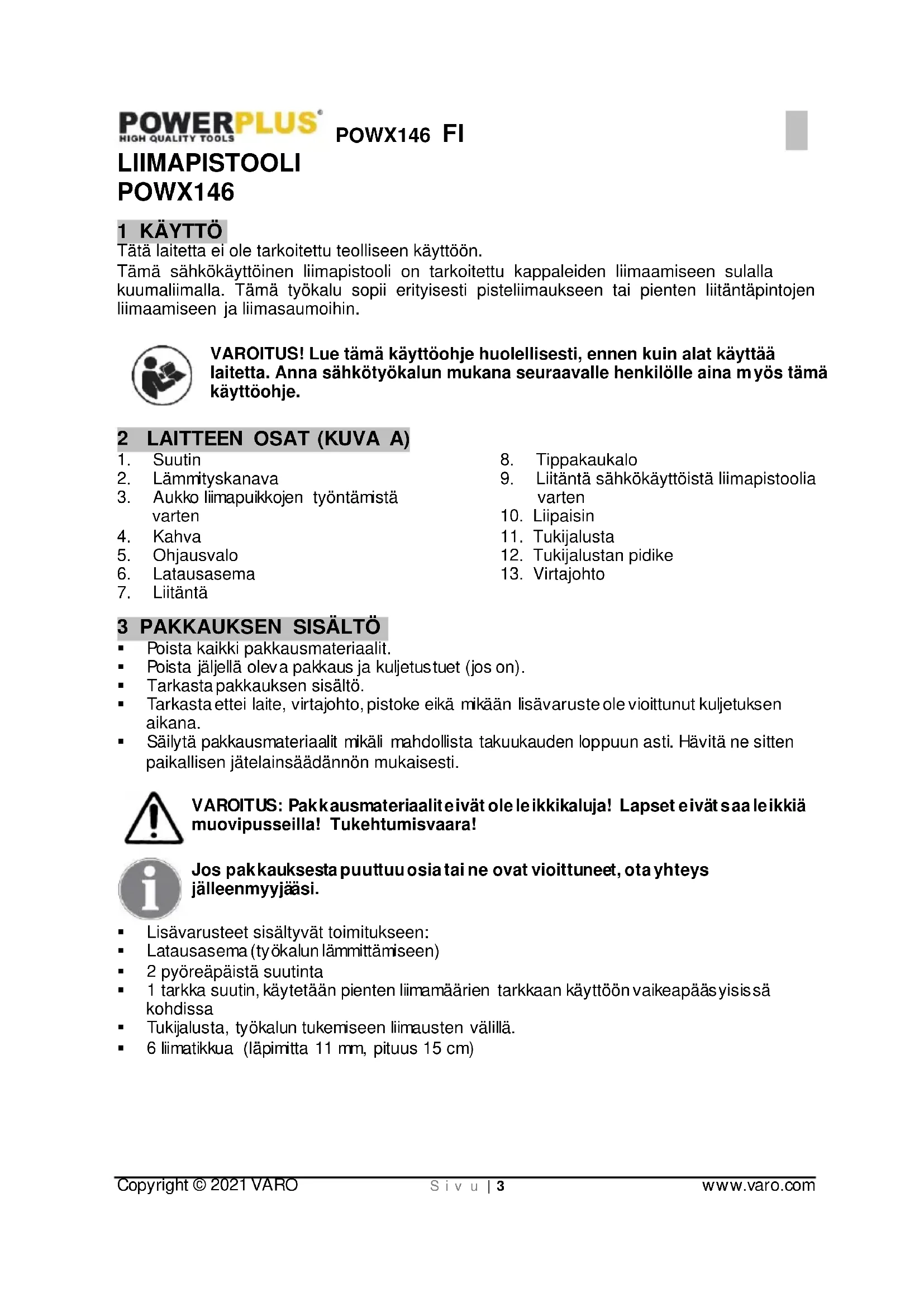 Korjauta laitteesi ainoastaan pätevällä ammattihenkilöllä, joka käyttää vain alkuperäisiä varaosia. Näin varmistat, että laitteesi on turvallinen sitä käytettäessä. 6 ERITYISET TURVAVAROITUKSET Tämä työkalu ei ole tarkoitettu henkisesti tai fyysisesti vammautuneiden henkilöiden (mukaan lukien lapset) käyttöön. Työkalu ei ole tarkoitettu sellaisten henkilöiden käyttöön, joilla ei ole tarvittavaa tietotaitoa ja/tai kokemusta. He saavat käyttää sitä vain jos heitä valvoo henkilö, joka vastaa heidän turvallisuudesta, tai he ole saaneet ohjeita työkalun oikeasta käytöstä. Pidä silmällä lapsia ja varmista, että he eivät leiki tällä työkalulla. Kytke työkalu aina pois toiminnasta, kun olet lopettanut työn, ja irrota sitten virtajohto pistorasiasta. Älä pane työkalua tukijalustaan (11), ennen kuin työkalu on täysin jäähtynyt. Älä peitä koskaan työkalua, kun se on kytketty päälle. Kotelo kuumenee, kun työkalu on kytketty päälle. Työkalun ylikuumeneminen voi saada aikaan tulipalon.POWX146 FI Copyright © 2021 VARO S i v u | 6 www.varo.com Aseta työkalu aina tukialustaan, kun sitä ei käytetä. Palamisvaara! Sähkökäyttöinen liimapistooli ja suutin saavuttaa jopa 200°C lämpötilan. Vältä suoraa kosketusta ihon ja kytketyn työkalun välillä sekä kosketusta nestemäiseen sulaan kuumaliimaan. Käytä silmäsuojaimia Käytä aina suojakäsineitä 7 LAITTEEN KOKOAMINEN
