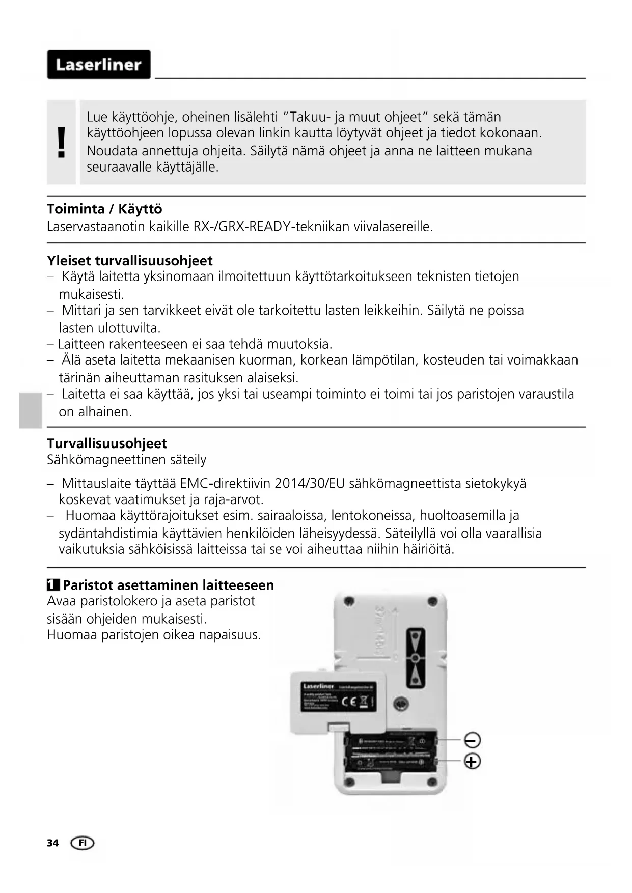 Yleiset turvallisuusohjeet – Käytä laitetta yksinomaan ilmoitettuun käyttötarkoitukseen teknisten tietojen mukaisesti. – Mittari ja sen tarvikkeet eivät ole tarkoitettu lasten leikkeihin. Säilytä ne poissa lasten ulottuvilta. – Laitteen rakenteeseen ei saa tehdä muutoksia. – Älä aseta laitetta mekaanisen kuorman, korkean lämpötilan, kosteuden tai voimakkaan tärinän aiheuttaman rasituksen alaiseksi. – Laitetta ei saa käyttää, jos yksi tai useampi toiminto ei toimi tai jos paristojen varaustila on alhainen. Turvallisuusohjeet Sähkömagneettinen säteily – Mittauslaite täyttää EMC-direktiivin 2014/30/EU sähkömagneettista sietokykyä koskevat vaatimukset ja raja-arvot. – Huomaa käyttörajoitukset esim. sairaaloissa, lentokoneissa, huoltoasemilla ja sydäntahdistimia käyttävien henkilöiden läheisyydessä. Säteilyllä voi olla vaarallisia vaikutuksia sähköisissä laitteissa tai se voi aiheuttaa niihin häiriöitä. Toiminta / Käyttö Laservastaanotin kaikille RX-/GRX-READY-tekniikan viivalasereille. Paristot asettaminen laitteeseen Avaa paristolokero ja aseta paristot sisään ohjeiden mukaisesti. Huomaa paristojen oikea napaisuus.