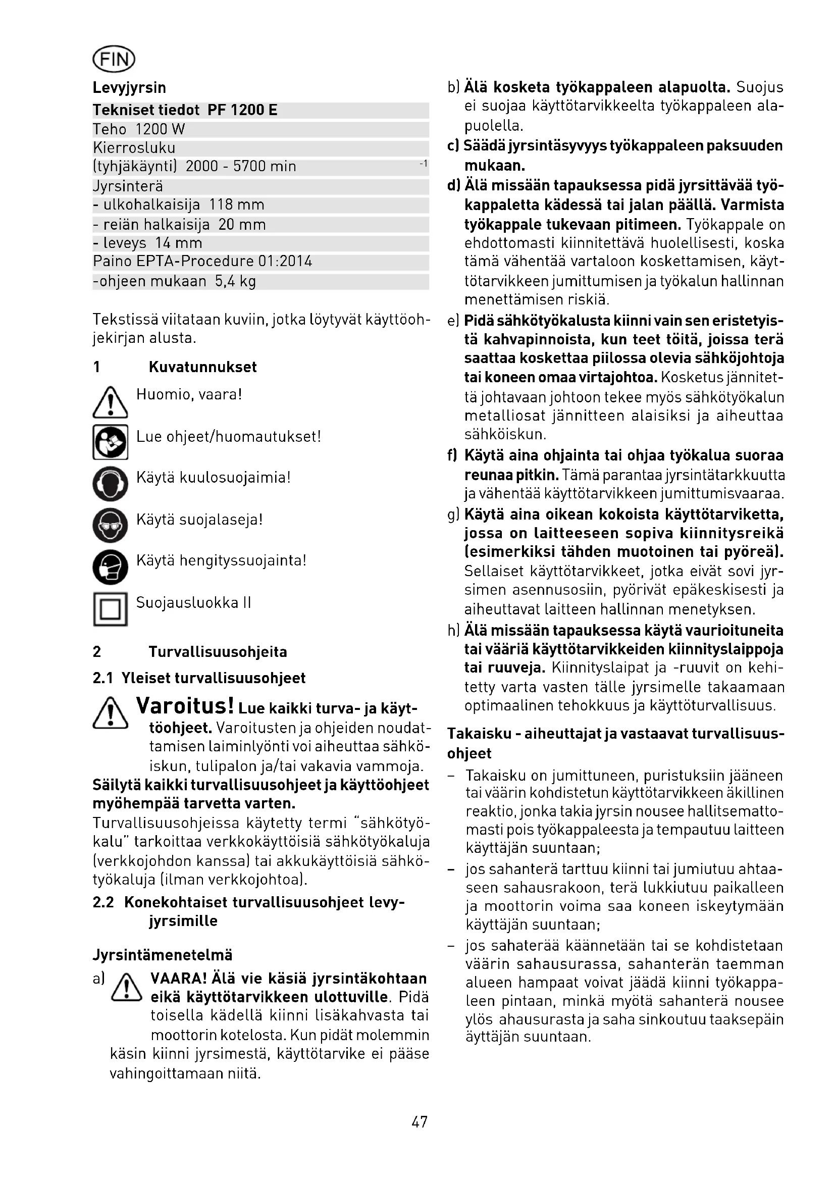 Jyrsinterä - ulkohalkaisija 118 mm - reiän halkaisija 20 mm - leveys 14 mm Paino EPTA-Procedure 01:2014 -ohjeen mukaan 5,4 kg Tekstissä viitataan kuviin, jotka löytyvät käyttöoh- jekirjan alusta. 1 Kuvatunnukset Huomio, vaara! Lue ohjeet/huomautukset! Käytä kuulosuojaimia! Käytä suojalaseja! Käytä hengityssuojainta! Suojausluokka II 2 Turvallisuusohjeita