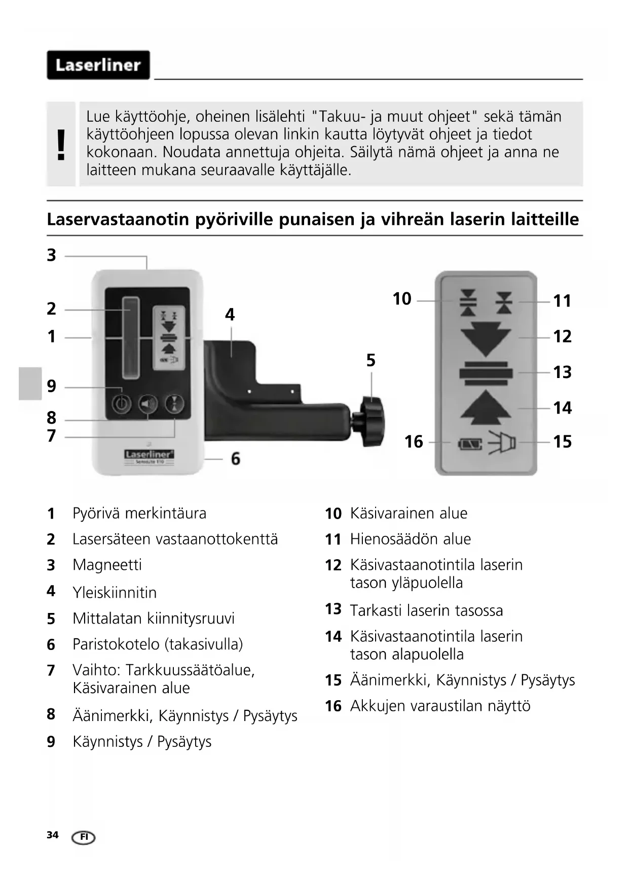 Laservastaanotin pyöriville punaisen ja vihreän laserin laitteille Pyörivä merkintäura Lasersäteen vastaanottokenttä Magneetti Yleiskiinnitin Mittalatan kiinnitysruuvi Paristokotelo (takasivulla) Vaihto: Tarkkuussäätöalue, Käsivarainen alue Äänimerkki, Käynnistys / Pysäytys Käynnistys / Pysäytys Käsivarainen alue Hienosäädön alue Käsivastaanotintila laserin tason yläpuolella Tarkasti laserin tasossa Käsivastaanotintila laserin tason alapuolella Äänimerkki, Käynnistys / Pysäytys Akkujen varaustilan näyttö FISensoLite 110 / SensoLite 110 G