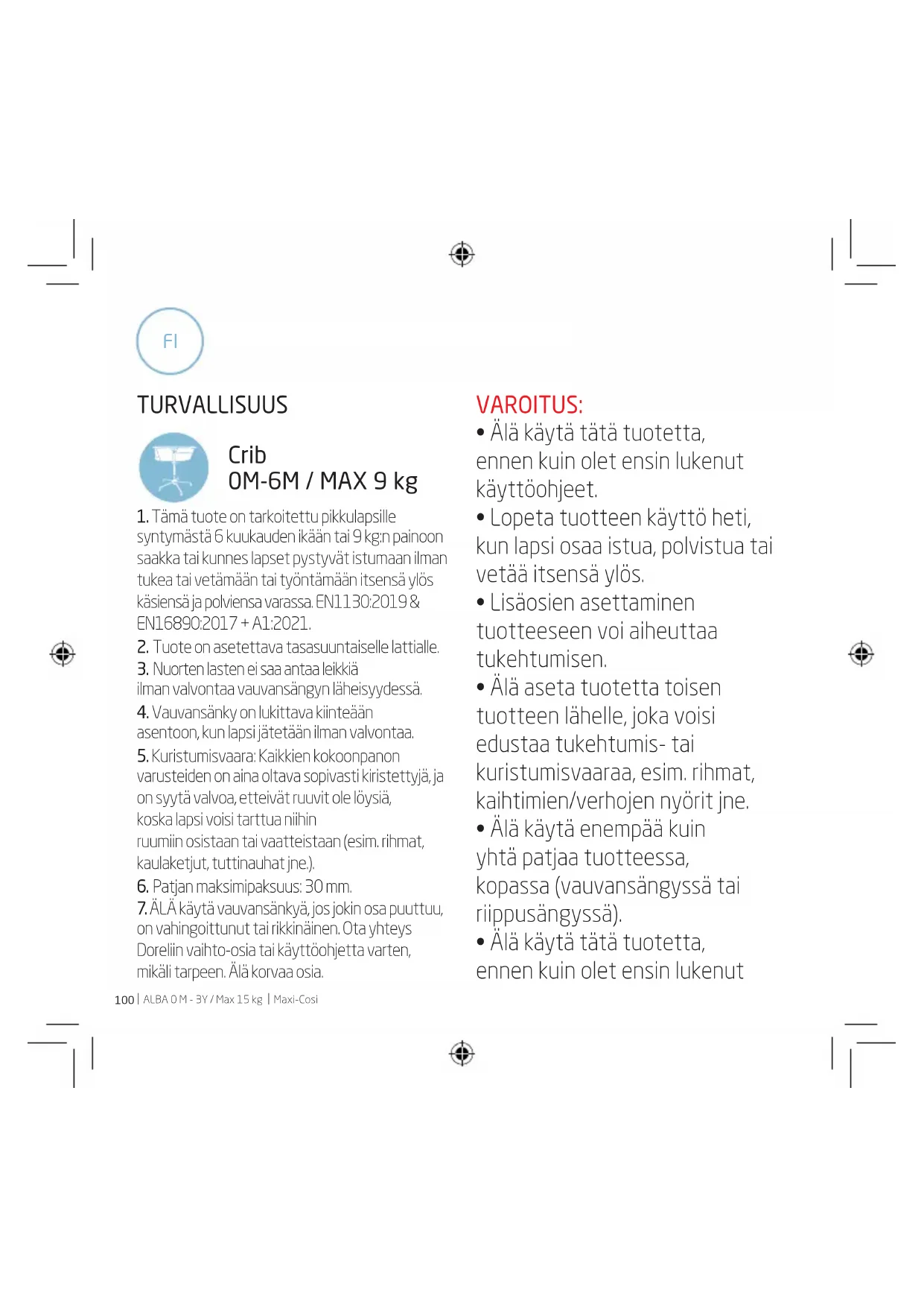 syntymästä 6 kuukauden ikään tai 9 kg:n painoon saakka tai kunnes lapset pystyvät istumaan ilman tukea tai vetämään tai työntämään itsensä ylös käsiensä ja polviensa varassa. EN1130:2019 & EN16890:2017 + A1:2021.